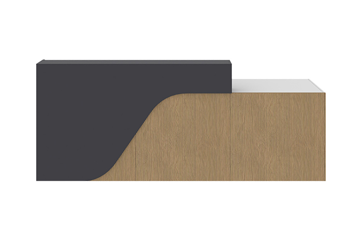 Larya Sol Yönlü Karşılama Bankosu, bir ofisin veya iş yerinin giriş bölümünde etkileyici bir ilk izlenim yaratmak üzere tasarlanmıştır. Bankonun ahşap görünümlü geniş yüzeyi ve antrasit rengin zarif birleşimi, modern ve davetkar bir atmosfer oluşturur. Estetik kıvrımlı geçişleri, tasarıma akıcı bir dokunuş katarak bankonun dinamik bir görünüm kazanmasını sağlar. Bu banko, sadece görsel olarak çekici olmakla kalmaz, aynı zamanda iç kısmında sağladığı geniş çalışma ve depolama alanıyla da son derece işlevseldir.
