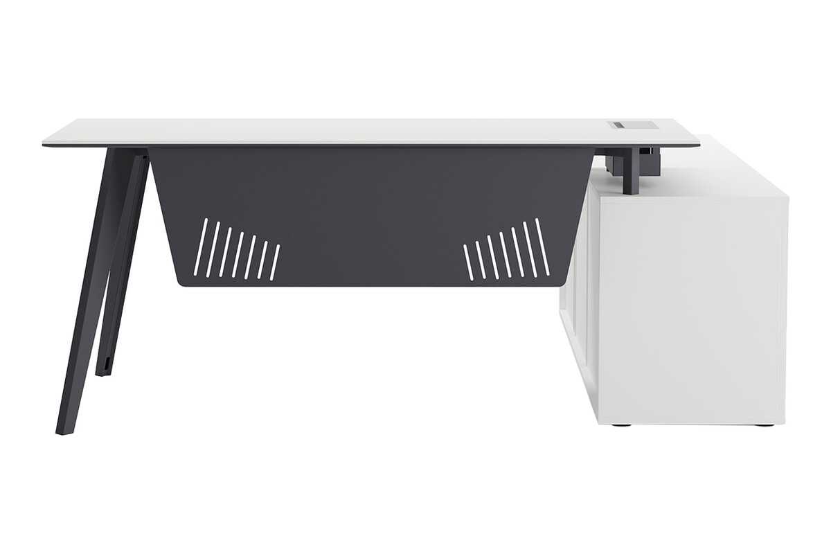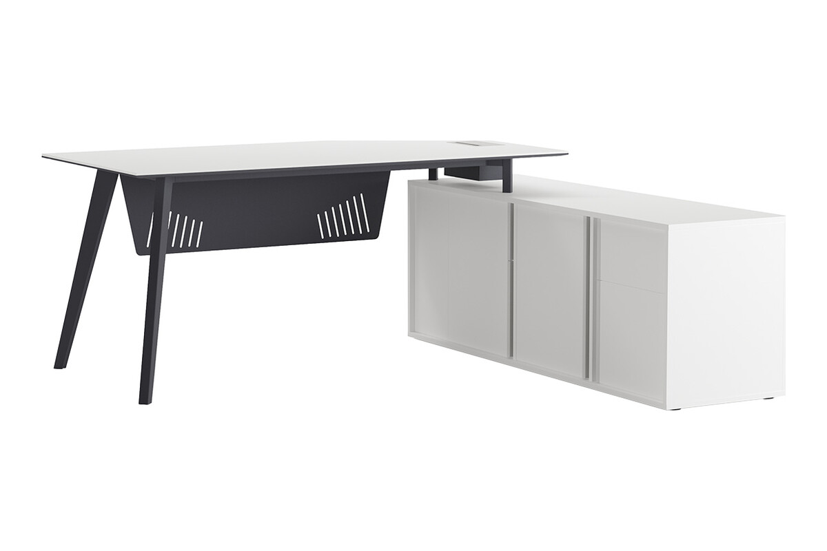 Blade Etajerli Ofis Masası, modern hatları ve fonksiyonel etajer tasarımıyla profesyonel alanlara dinamizm katar. Ölçü, etajer yönü ve ön panel seçenekleriyle kişisel tercihlere göre uyarlanabilir. Dayanıklı yapısı ve akıcı formu, uzun ömürlü kullanım garantisi sunar.