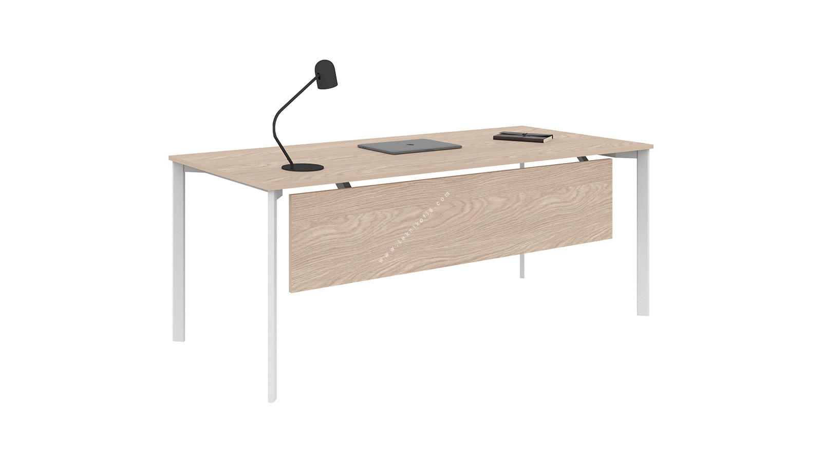Eflorant 4 Ayaklı Çalışma Masası, modern ofislerin estetik ve pratik ihtiyaçlarını karşılamak üzere tasarlanmıştır. Masa, geniş bir çalışma yüzeyi ve ince metal ayak yapısıyla dikkat çeker. Üst tablasındaki açık renk yüzey ve altındaki panelin uyumu, masaya çağdaş bir estetik katmaktadır. Masanın sade ve fonksiyonel tasarımı, her türlü ofis ortamına kolayca entegre olabilir. Bu sayede, çalışma alanınızda hem düzeni sağlar hem de şık bir görünüm sunar.