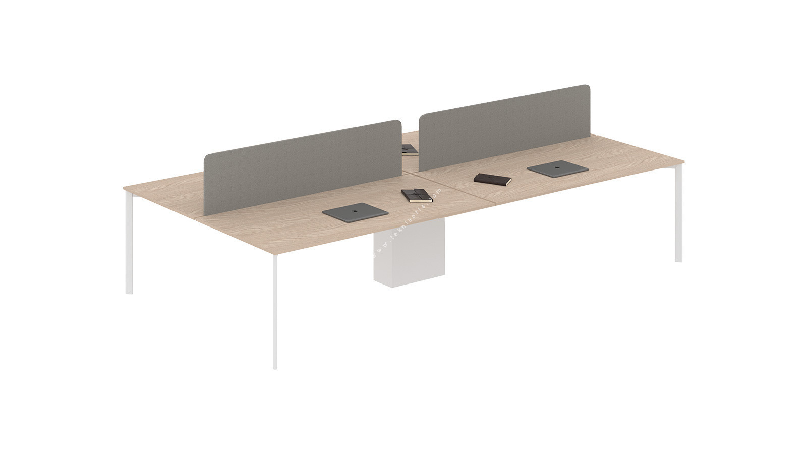 Beyaz metal ayaklar, çalışma grubuna modern bir duruş ve sağlam bir destek verir, uzun ömürlü kullanım imkanı sunar. Bu modern çalışma masası, açık plan ofislerde daha odaklanmış ve verimli bir çalışma ortamı yaratmayı hedefleyen, fonksiyonellik ve pratik faydaları ön planda tutan ideal bir çözümdür.