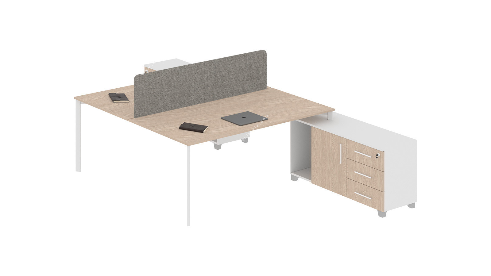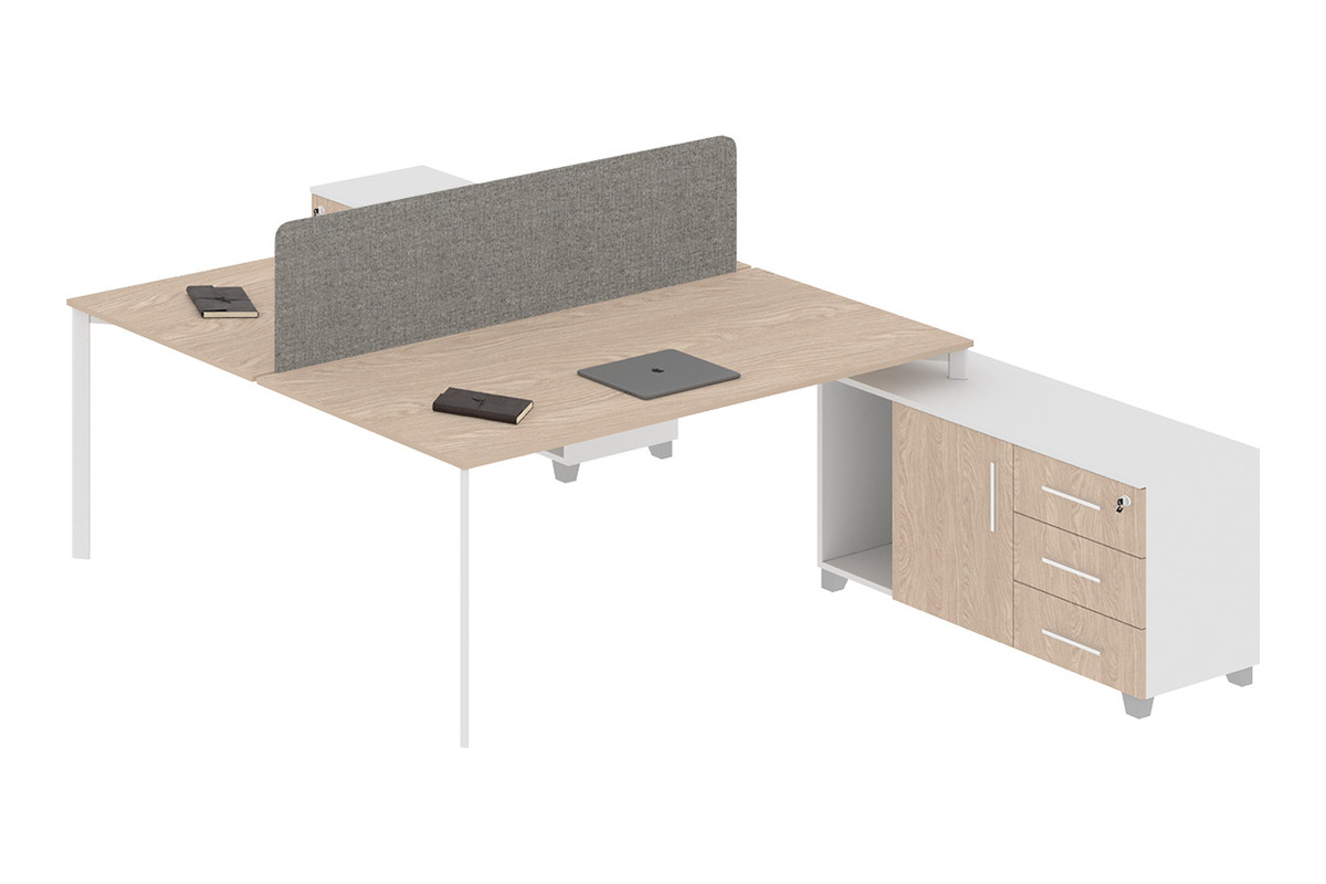 İki kişilk çalışma masasına entegre konsol, kişisel eşyalar ve ofis malzemeleri için pratik depolama çözümleri sunar. Konsolun çekmeceleri ve kapalı dolap bölmeleri, düzenli bir çalışma ortamı sağlar. Kumaş seperatör, sesi kısmen izole ederek daha sessiz bir çalışma ortamı yaratmaya yardımcı olur.