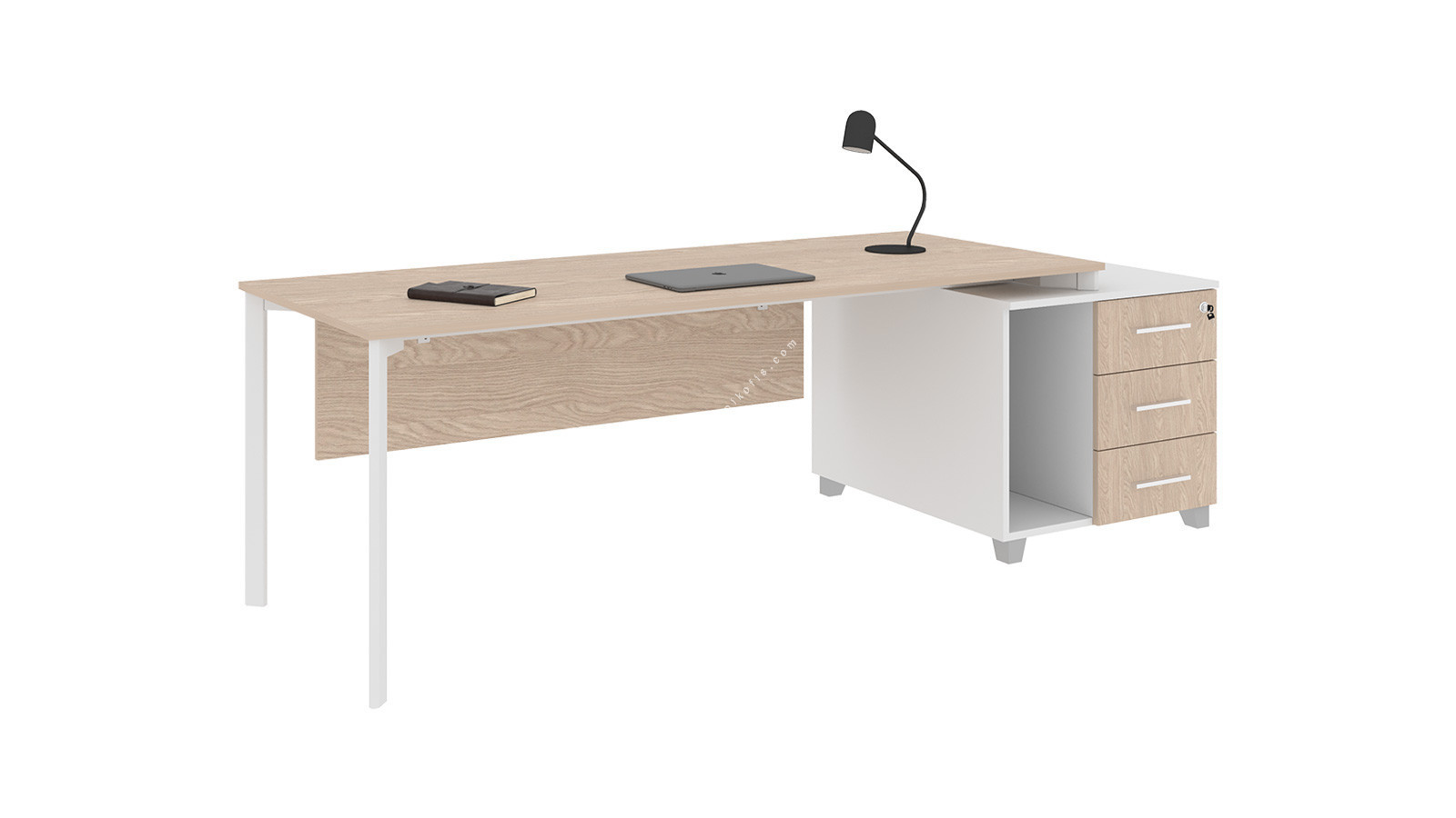 Eflorant Sağ Etajerli Metal Ayaklı Çalışma Masası, çağdaş ofis ortamları için tasarlanmış, estetik ve işlevselliği bir arada sunan özel bir mobilya parçasıdır. Bu masa, çalışma alanınızda düzeni ve verimliliği desteklemek üzere özenle üretilmiştir.