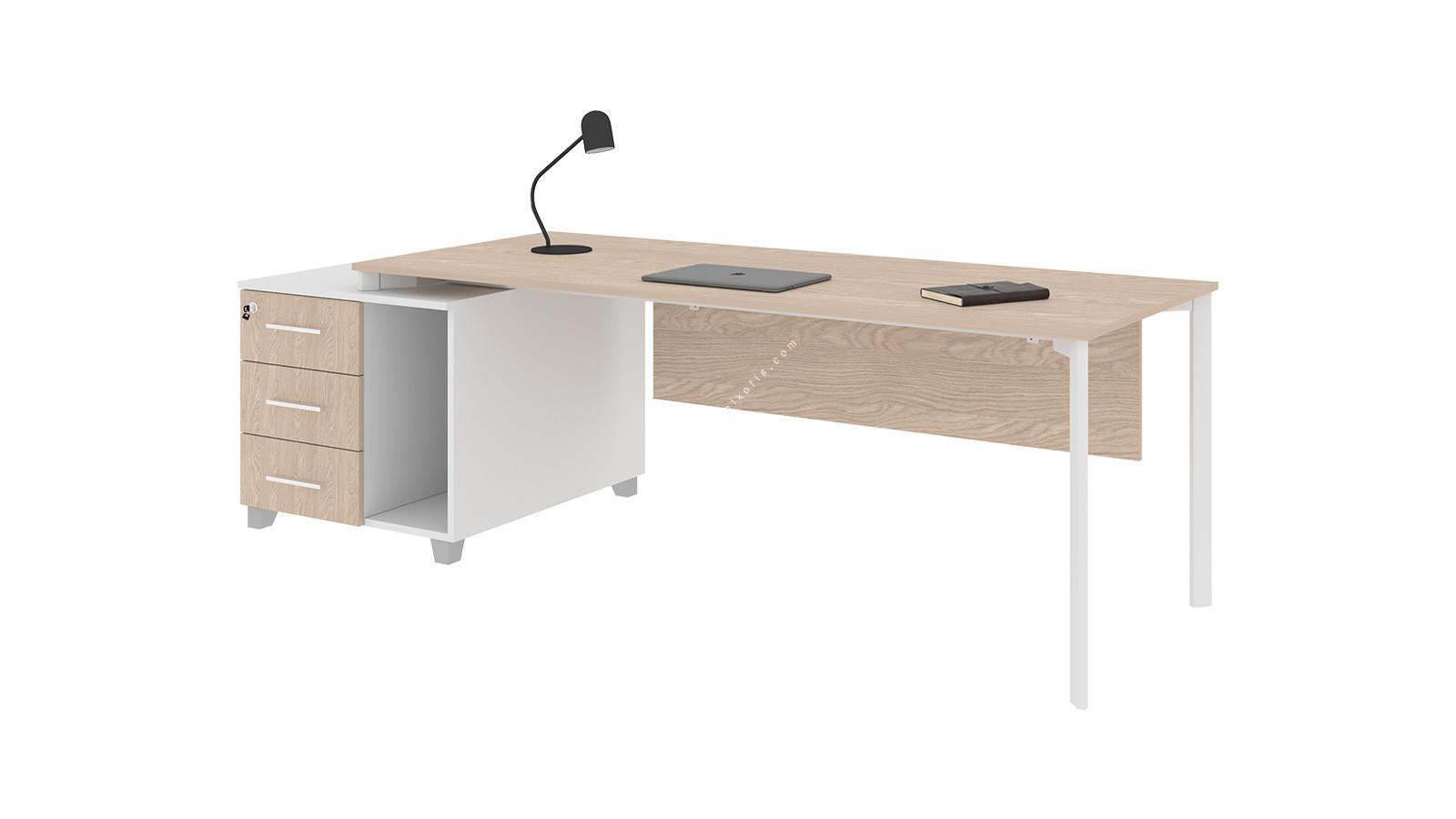 Eflorant Sol Etajerli Metal Ayaklı Çalışma Masası, çağdaş ofis ortamları için tasarlanmış, estetik ve işlevselliği bir arada sunan özel bir ofis mobilyasıdır. Bu masa, çalışma alanınızda düzeni ve verimliliği desteklemek üzere özenle üretilmiştir.