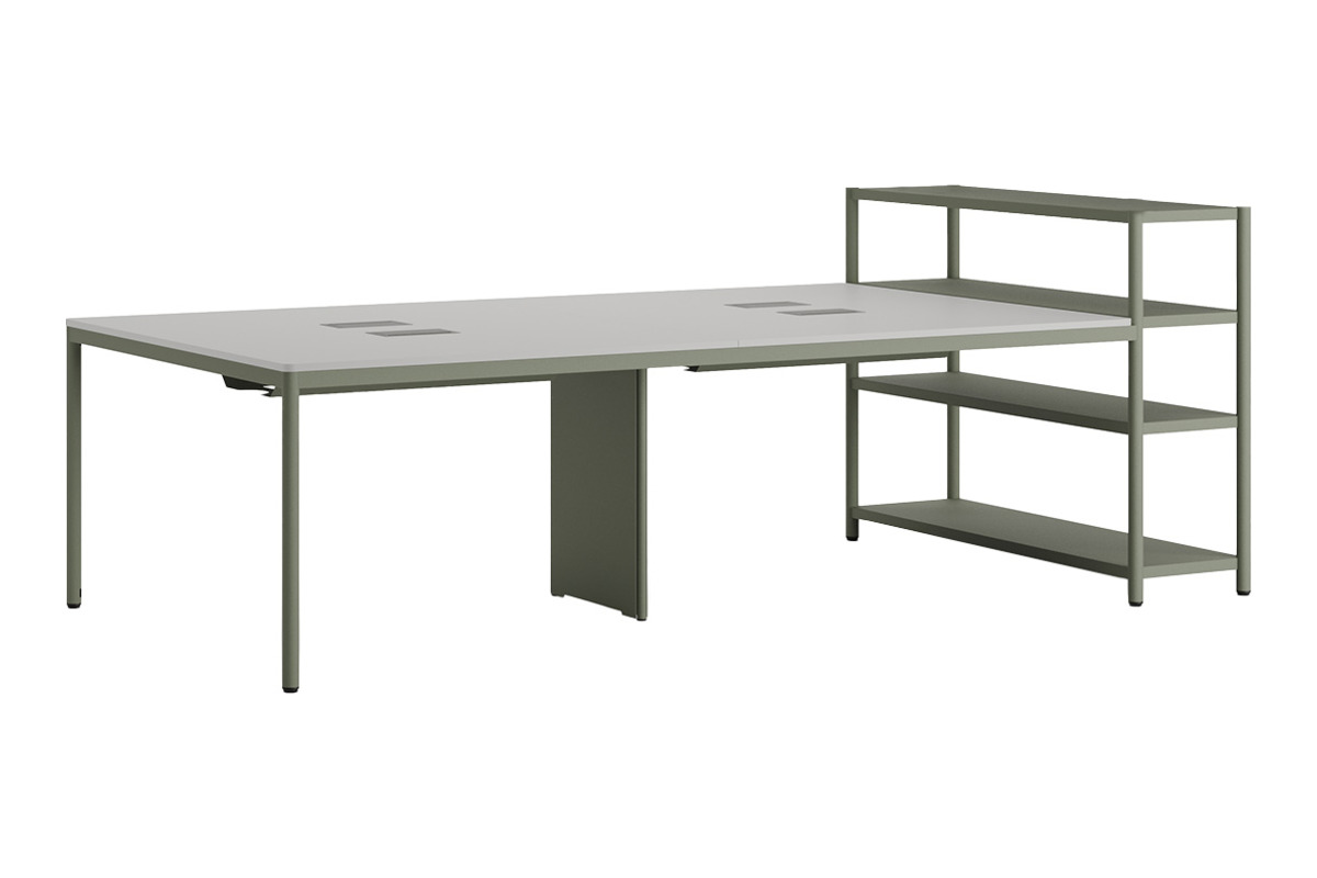 Jala Raflı Dörtlü Çalışma Masası, ekip sinerjisini artırmak için tasarlanmış bütünleşik bir ofis çözümüdür. Geniş tabla yüzeyi, dört kullanıcının da konforla çalışabileceği bir alan sunarken, raf ünitesi dosyalama ve ekipman paylaşımı için ideal bir nokta oluşturur.