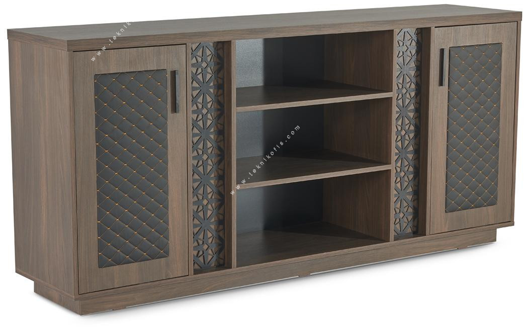 Elevon Motifli Yönetici Dolabı, melamin gövdesi üzerindeki zarif deri dikiş detayları ve dekoratif motiflerle yönetici odalarına özel bir estetik kazandırır. Geniş iç hacmi evrak, klasör ve ofis gereçlerini düzenli ve erişilebilir şekilde saklamanıza yardımcı olur. Modern ofis dekorasyonuyla uyumlu bir depolama çözümüdür.
