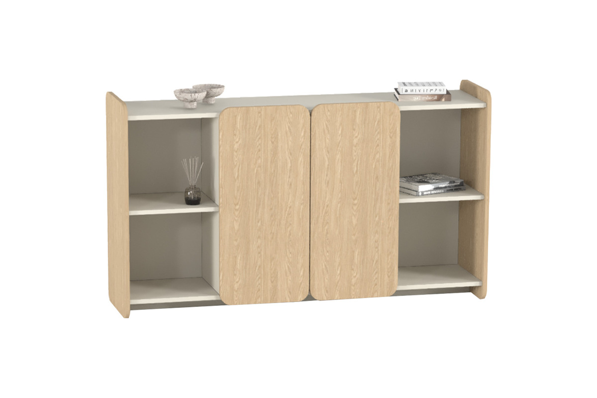 Dolap, iki adet merkezi kapaklı bölme ve her iki yanda bulunan açık raflardan oluşmaktadır. Açık raflar, dekoratif objeler, kitaplar veya sık kullanılan dosyalar için kolay erişilebilir bir alan sunarken, kapaklı bölmeler kişisel eşyaların veya önemli belgelerin düzenli bir şekilde saklanmasını sağlar. Üst tablası, ek depolama veya dekoratif objeler için geniş bir yüzey sunar. Yüksek kaliteli malzemelerden üretilen ofis mobilyası, dayanıklı yapısıyla uzun ömürlü bir kullanım vaat eder. Hem estetik hem de pratik bir depolama çözümü arayanlar için idealdir.