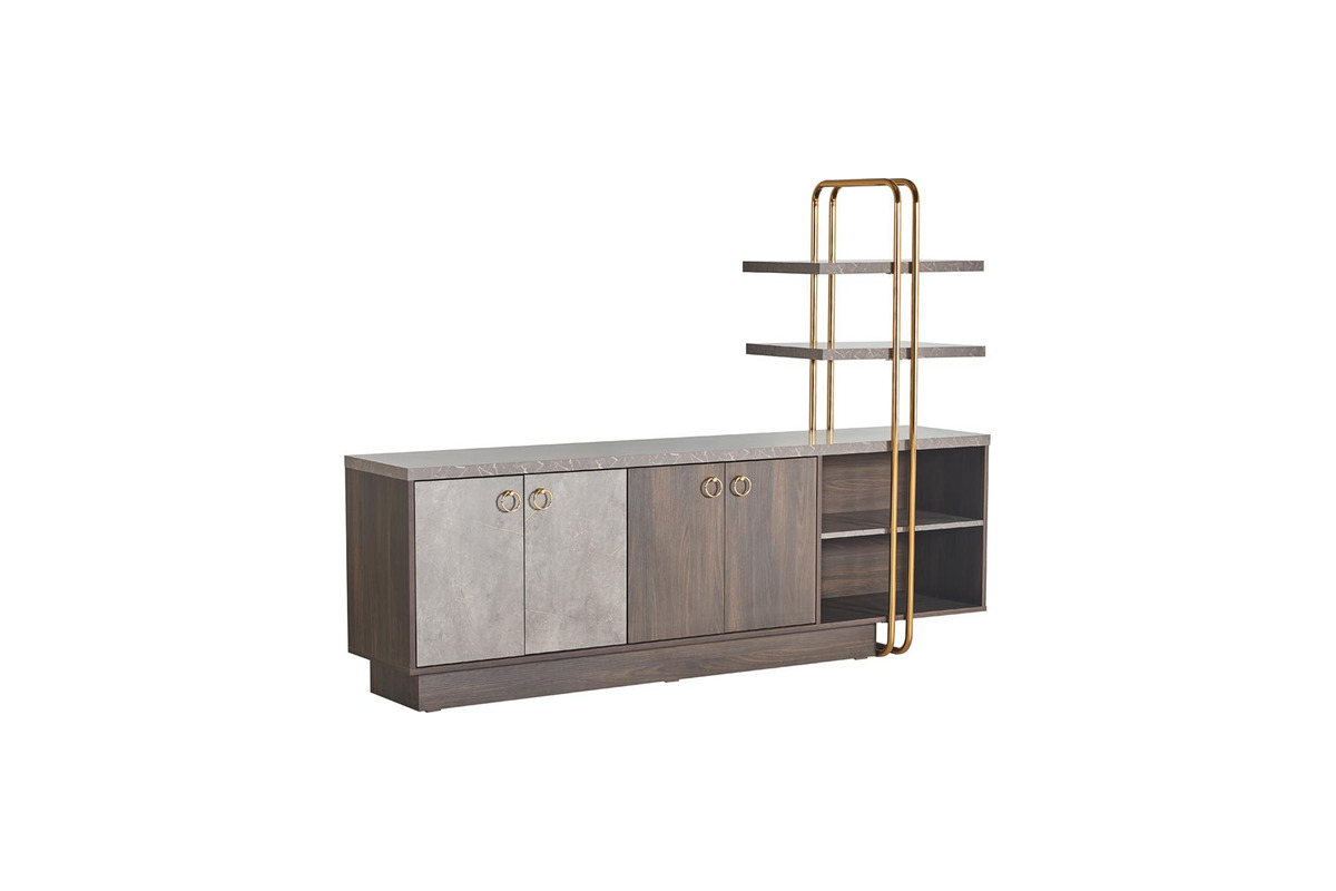 Marcelin Metal Raf Detaylı Dolap, altın renkli metal boru ayaklarıyla modern yönetici odalarına zarif bir tamamlayıcı sunar. Geniş iç hacmi sayesinde evrak, dosya ve ofis ekipmanlarının düzenli şekilde saklanmasına olanak tanır. Yönetici takımıyla bütünlük sağlayan şık bir depolama çözümüdür.