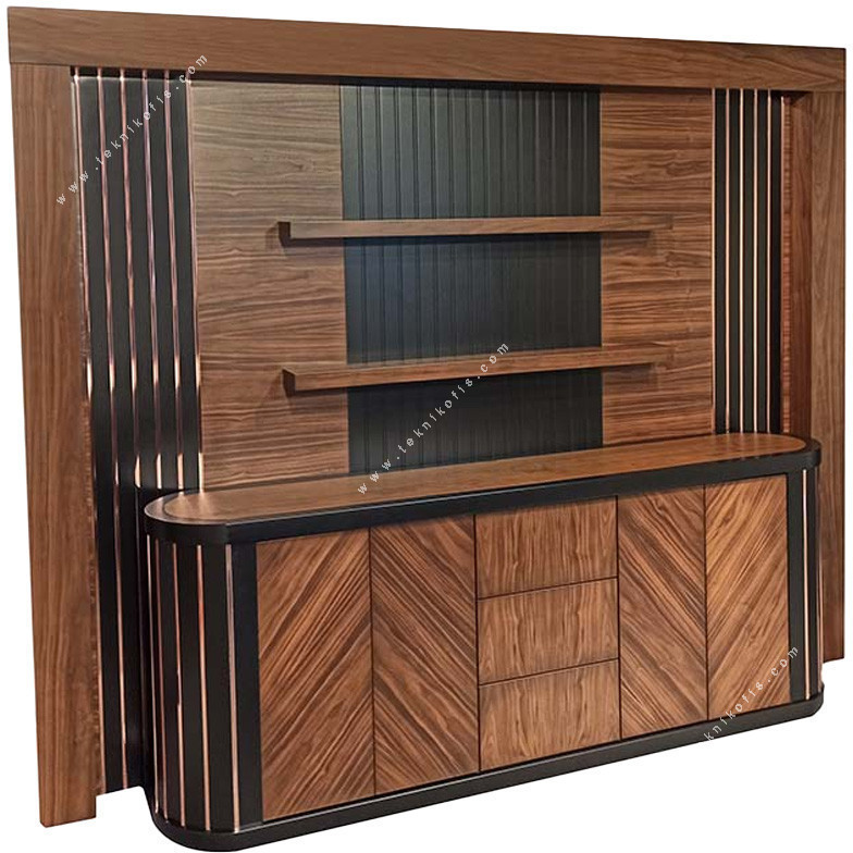 Orden Ceviz Makam Arka Fonu, makam odasında masa arkasındaki duvar boşluğunu değerlendirerek ofise derinlik ve estetik kazandırır. Ceviz kaplama ve geometrik tasarım çizgisi ile panel, ofis dekorasyonuna sofistike ve dengeli bir arka plan sağlar. Panel, masa ve dolap ile birlikte kullanıldığında, oda genelinde güçlü bir uyum ve prestijli bir atmosfer yaratır. Ürün içersinde konsol dahil değildir.