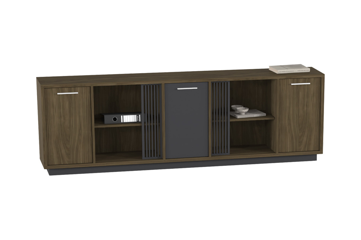 Soventra Yönetici Ofis Dolabı, yönetici ofisleri ve prestijli çalışma alanları için tasarlanmış şık ve kullanışlı bir depolama birimidir. İki yana açılan ahşap kapaklar ve orta kısımda bulunan açık raflar ve kapalı bölme, evrak, kitap ve dekoratif objeler için bolca depolama alanı sunar. Üst tablası, süs eşyaları veya ek depolama için geniş bir yüzey sağlar.