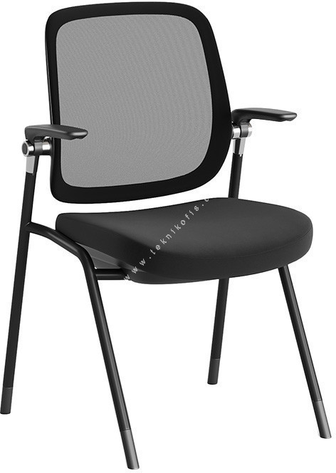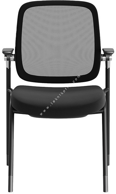 Junmo Boru Ayaklı Sandalye, toplantı, eğitim ve konferans alanları için tasarlanmış, işlevsel ve modern bir sandalyedir. Koltuğun en belirgin özelliği, uzun süreli oturumlarda bile hava akışını destekleyen ve konforu artıran siyah, gergin file sırtlığıdır. Oturma minderi, sade ve şık bir görünüm sunan siyah döşeme ile kaplanmıştır. Koltuk, sabit duruş sağlayan ve kolay istiflemeye olanak tanıyan siyah boru metal iskelet üzerine kuruludur ve sandalyenin kavisli kolçakları konforlu bir kol dayama alanı sunar.