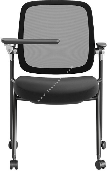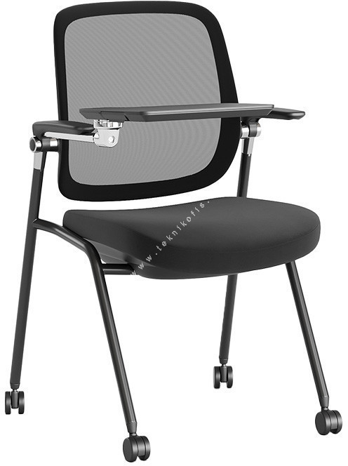 Junmo Yazı Tablalı Tekerlekli Konferans Koltuğu, eğitim, seminer ve çok amaçlı toplantı odaları için özel olarak tasarlanmış, tam donanımlı bir çözümdür. Sandalyenin temel yapısı, uzun süreli oturumlarda hava akışını destekleyen siyah file sırtlık ve konforlu, siyah döşemeli oturma minderi içerir. En önemli özelliği, kolçağa entegre edilmiş ve kolayca katlanıp açılabilen, geniş yazı tablasıdır. Bu tabla, defter, tablet veya dizüstü bilgisayar kullanımı için anında bir çalışma yüzeyi sağlar, bu da onu öğrenci veya katılımcı odaklı etkinlikler için ideal kılar.