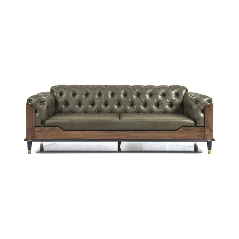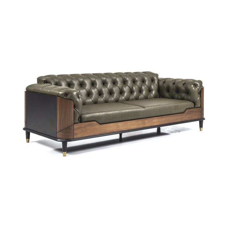 Admin Üçlü Kanepesi, kapitoneli ön yüzeyi ve zarif dikiş detaylarıyla klasik lüks görünümü modern bir ofis çizgisiyle birleştirir. Kanepeyi öne çıkaran en güçlü detay ise arka çevresinde kullanılan ceviz ahşap kaplama yüzeylerdir. Bu ahşap çerçeve, kanepenin hem estetik duruşunu güçlendirir hem de VIP yönetici odalarında dekoratif bir odak noktası oluşturur.