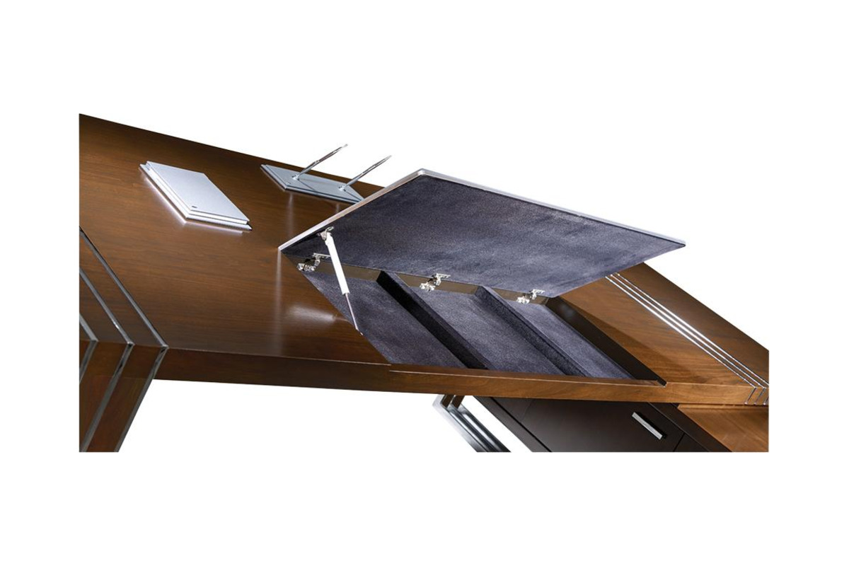 Interest Makam Masası, zengin ceviz kaplaması ve deri detaylarıyla ofisinize hem sıcaklık hem prestij kazandırır. Geniş, rahat çalışma yüzeyi evrak, bilgisayar ve ofis gereçlerini düzenli şekilde yerleştirmenize imkan tanır. Modern ve klasik çizgilerin dengesi, makam odanızda profesyonel ama aynı zamanda davetkar bir atmosfer yaratır.