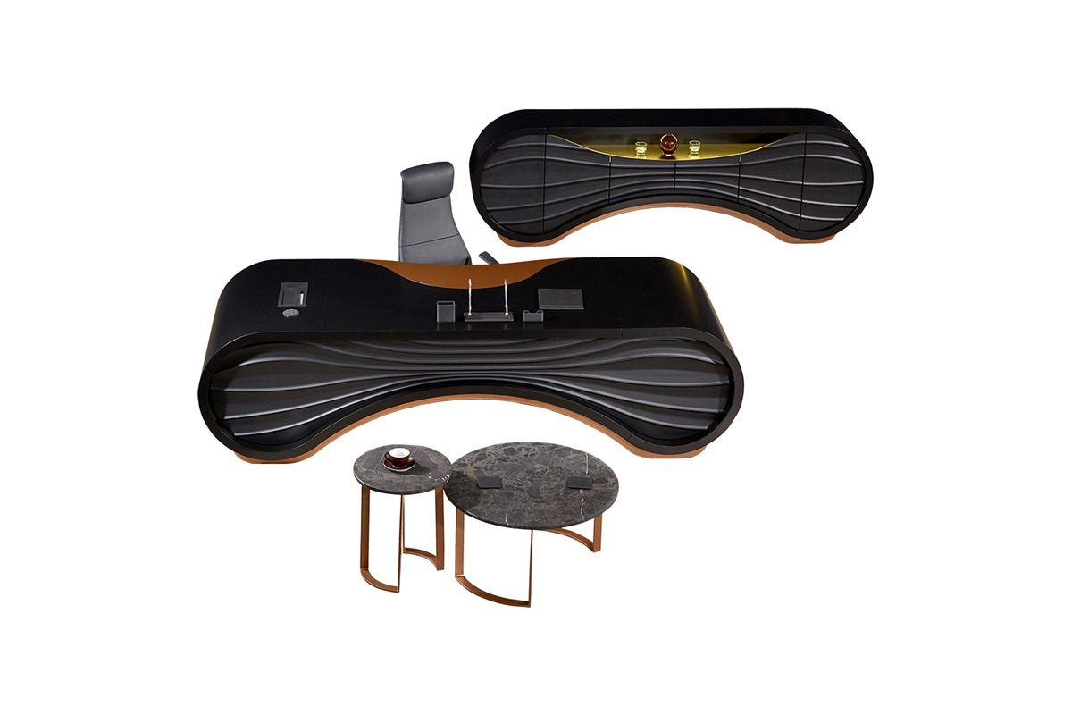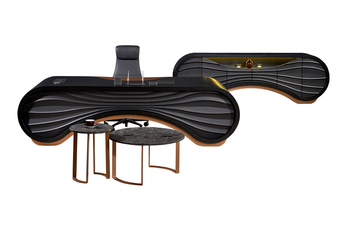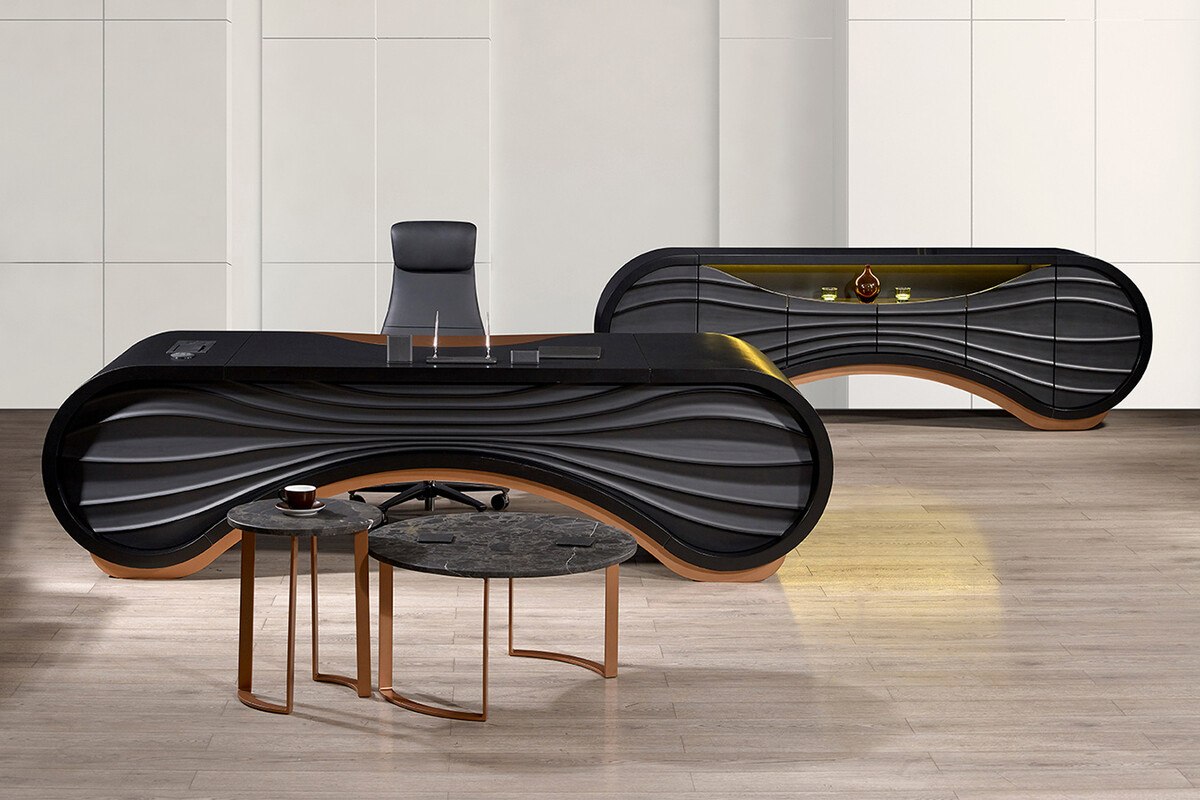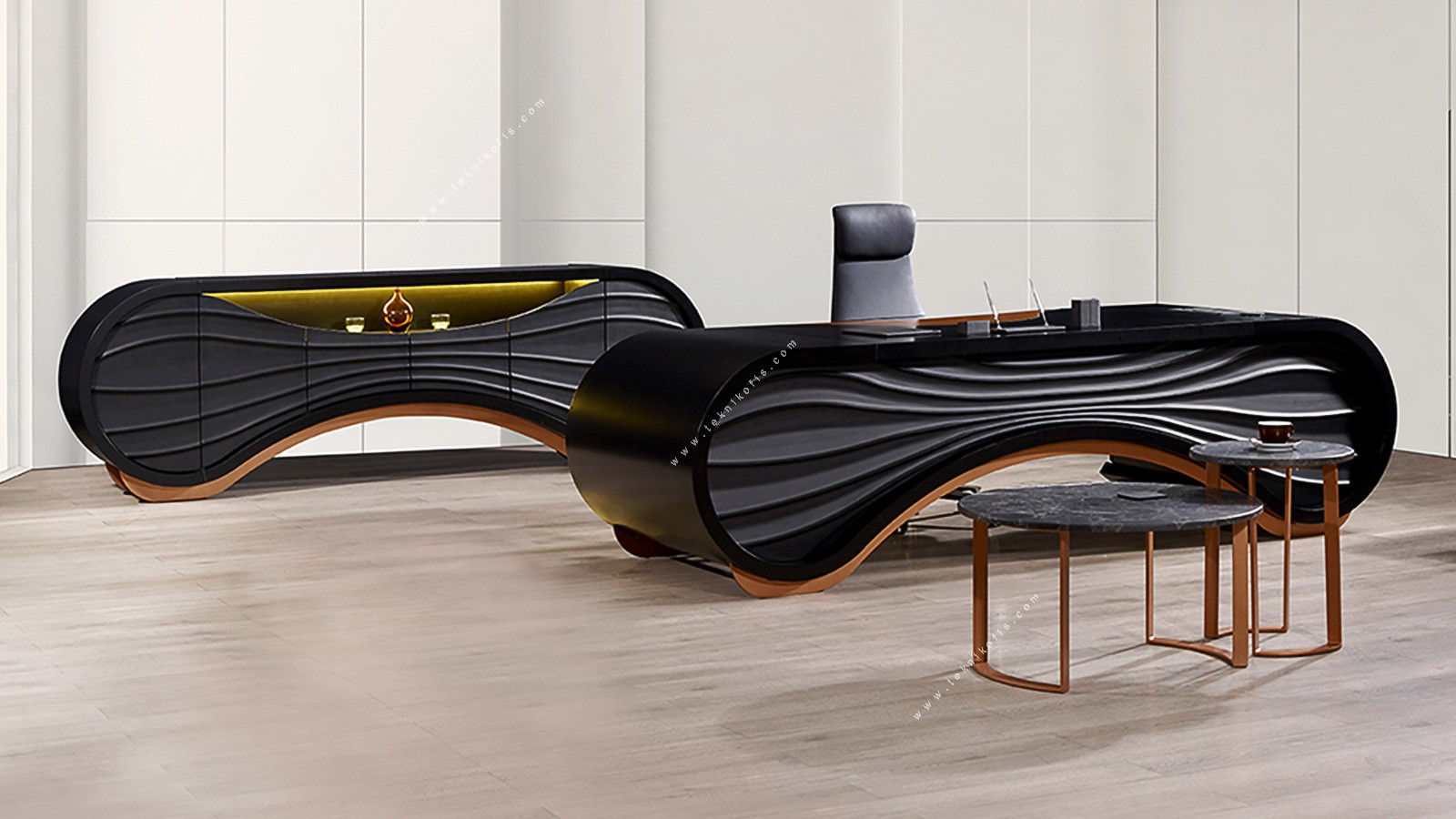Bu makam mobilyası takımı, ofisinizin sadece bir çalışma alanı olmaktan çıkıp, kurum kimliğinizin modern ve iddialı yönünü yansıtan bir temsil aracı haline gelmesini sağlar. Tasarımındaki cesur hatlar ve yenilikçi yaklaşım, ziyaretçileriniz üzerinde unutulmaz bir izlenim bırakırken, yöneticinin vizyonunu ve modern dünya ile olan bağını vurgular. Estetik detaylara verilen önem ve malzeme seçimindeki lüks, bu takımı ofis mobilyasından öteye taşıyarak, prestijli bir yatırım haline getirir.
