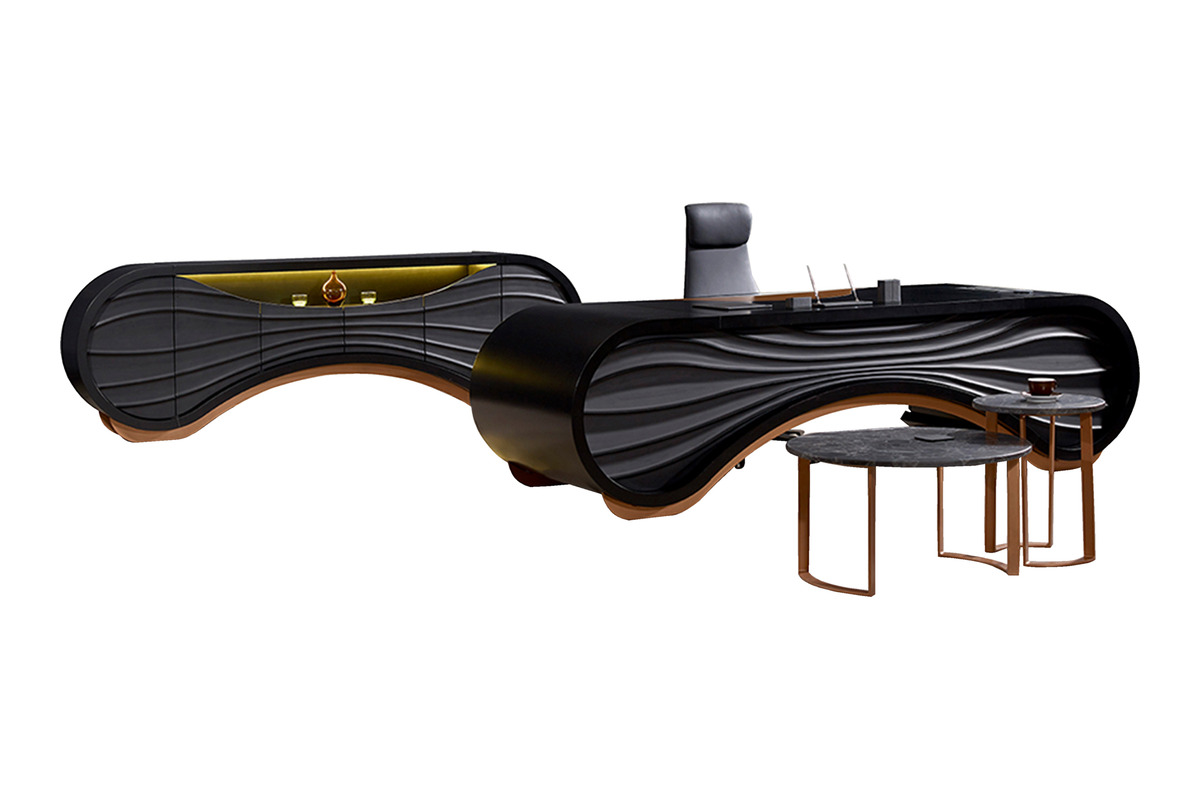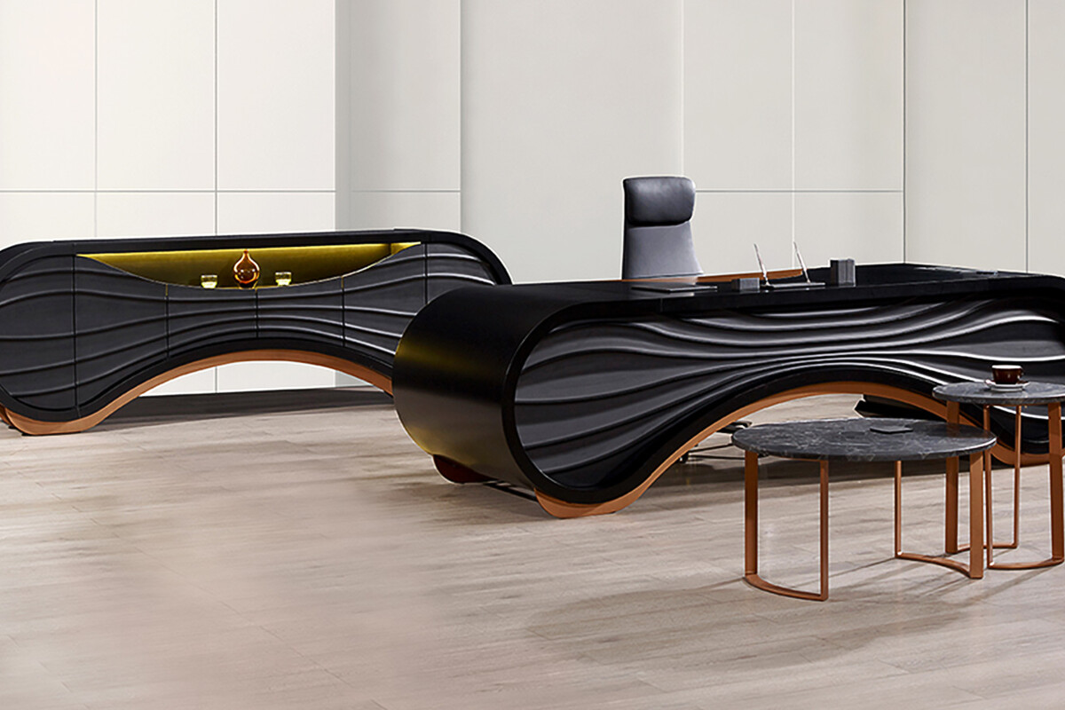 Dark Dekoratif Mermer Sehpalı Makam Takımı, modern ofis ambiyansına heykelsi ve çağdaş bir zarafet katmak üzere tasarlanmıştır. Akıcı ve dalgalı çizgilerle şekillendirilmiş masası ve depolama ünitesi, dinamik bir görsel şölen sunar. Tasarımındaki siyahın asaleti ve mermer görünümlü eşsiz desenleriyle birleşimi, mekana lüks ve sofistike bir atmosfer kazandırır.