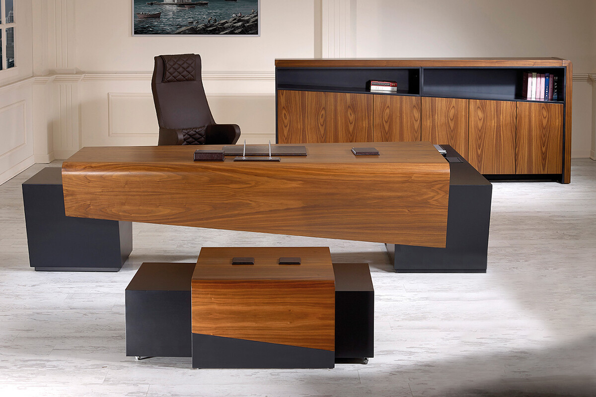 Fame Etajerli Makam Takımı, modern tasarımı ve sanatsal çizgileriyle ofisinize sofistike bir estetik ve dikkat çekici bir kimlik kazandırır. Koyu ahşap tonları ile siyahın dengeli uyumu, mekana hem sıcak hem de profesyonel bir hava katarken, masanın ve sehpanın asimetrik ve açılı formları tasarıma dinamik ve özgün bir dokunuş ekler. Bu uyumlu renk ve form kombinasyonu, ofisinizin genel atmosferini yükselterek çağdaş bir görünüm sağlar.