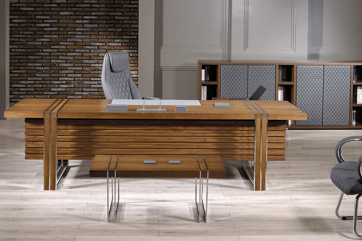 Takımın şık hatları ve lüks yapısı, modern ofis mimarisine mükemmel bir uyum sağlar. Şık masası, geniş konsolu ve zarif sehpasıyla bir bütünlük oluşturan bu takım, ofisinizde görsel bir denge ve düzen sunar. Makam odası mobilya takımı, estetik detaylardaki özeniyle mekanınızda ilham verici ve prestijli bir çalışma ortamı yaratır, kişisel zevkinizi ve profesyonelliğinizi yansıtır.