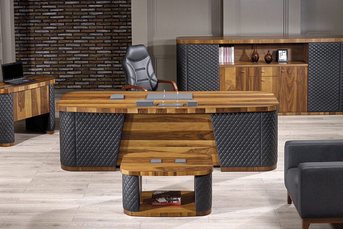 Monial Makam Takımı, modern tasarımı ve göz alıcı deri detaylarıyla ofisinize lüks bir estetik ve sofistike bir atmosfer kazandırır. Takımın doğal ahşap tonları, mekana sıcaklık ve derinlik katarken, takımda kullanılan deri paneller tasarıma dinamik ve özgün bir dokunuş ekler. Bu uyumlu ahşap ve deri kombinasyonu, ofisinizin genel atmosferini yükselterek çağdaş bir görünüm sağlar.