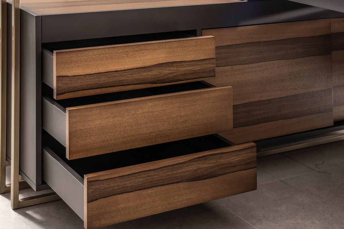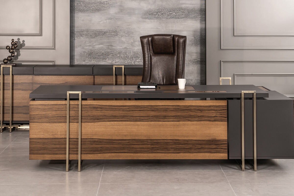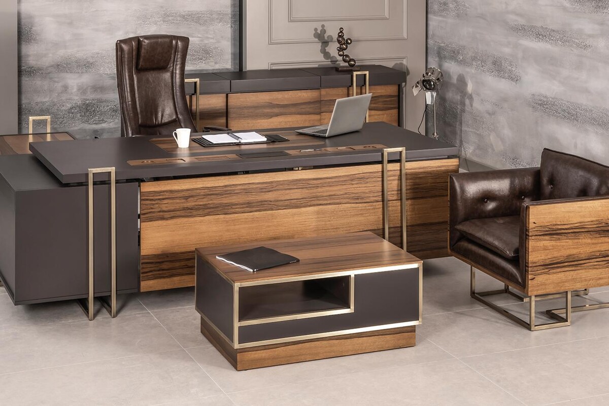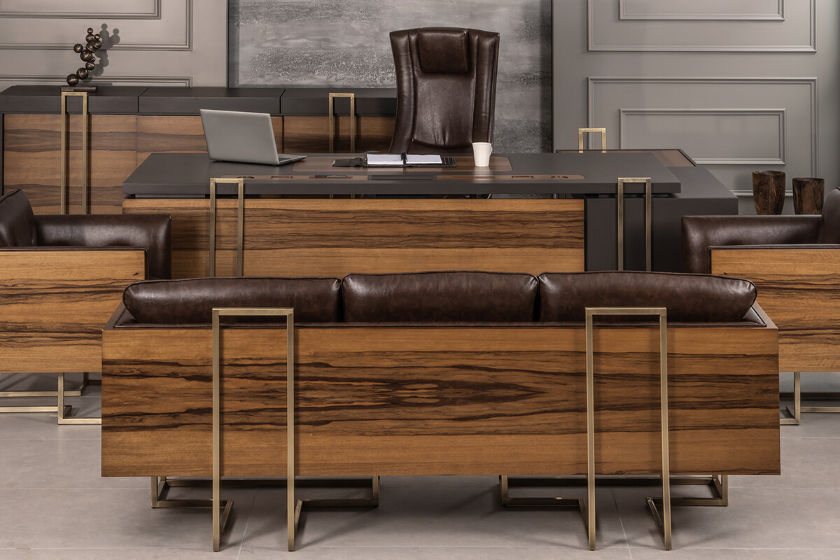 Ahşap Yönetici makam takımı yapısında ağırlıklı ahşap malzeme kullanılarak imal edilmiştir. Doğal ahşap hareli ofram kaplama ve poliüretan cilalıdır. Dolap üstü ve etajer üstü kayarak açılan gizli kapak sistemlidir. Ahşap yönetici takımı farklı ve benzersiz yapıda tasarlanmış ayaklara sahiptir. Ayak modülü metal ve eskitme sarı pirinç renktedir. Yönetici makam takımını yumuşak dokulu ve hafif nemli bir bez yardımıyla temizliği yapılabilir. Ahşap yönetici makam takımı çalışma masası, dolap, etajer ve sehpadan oluşan bir takımdır.