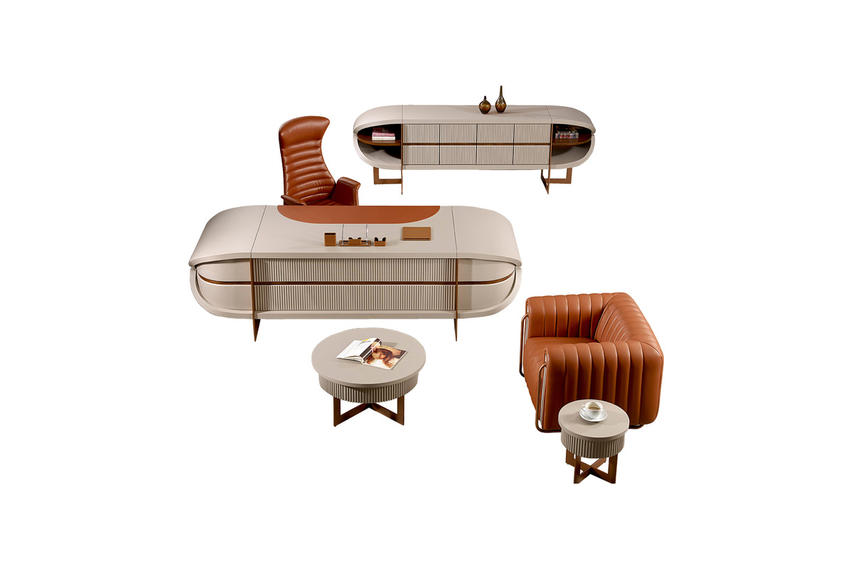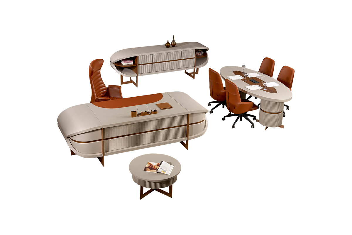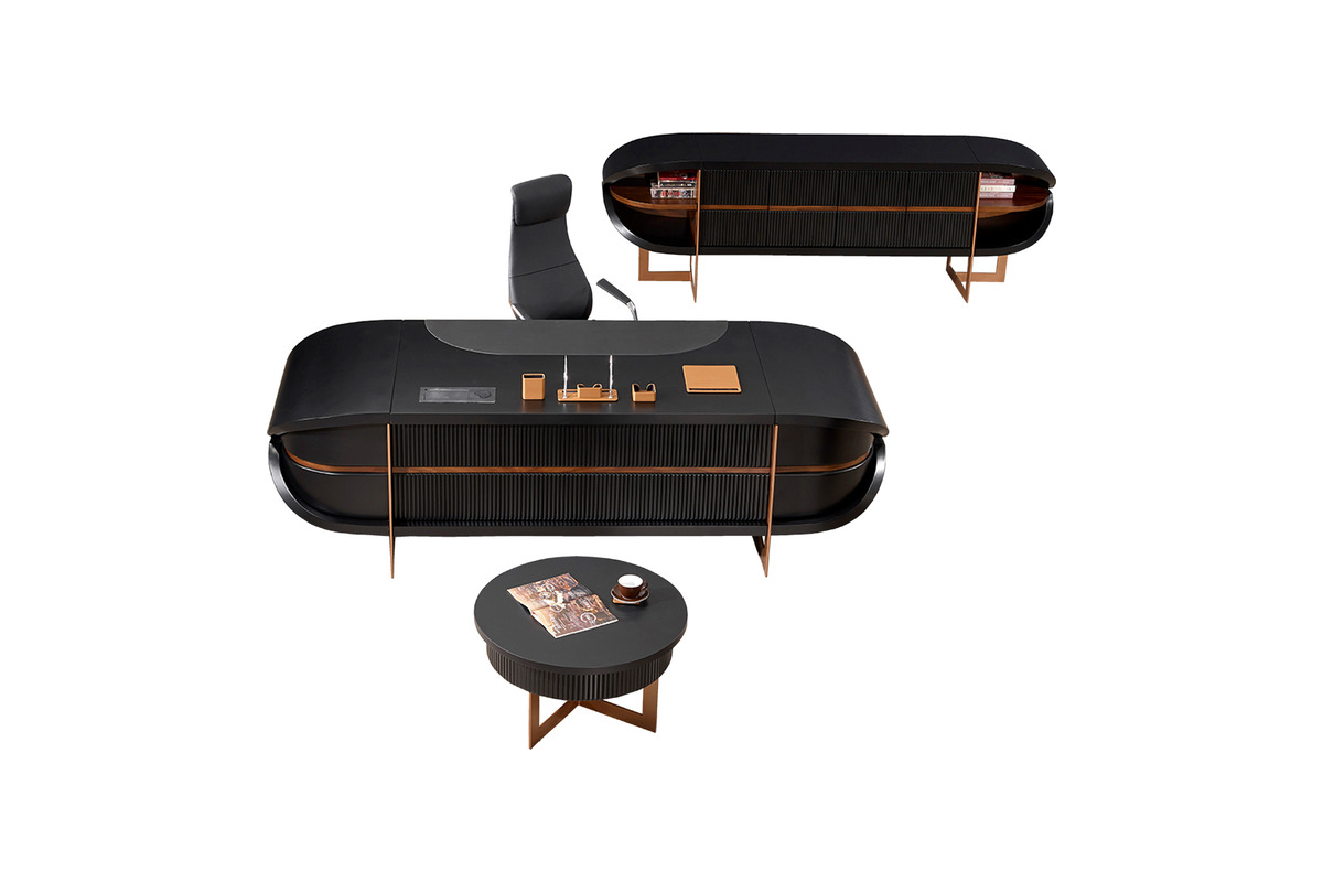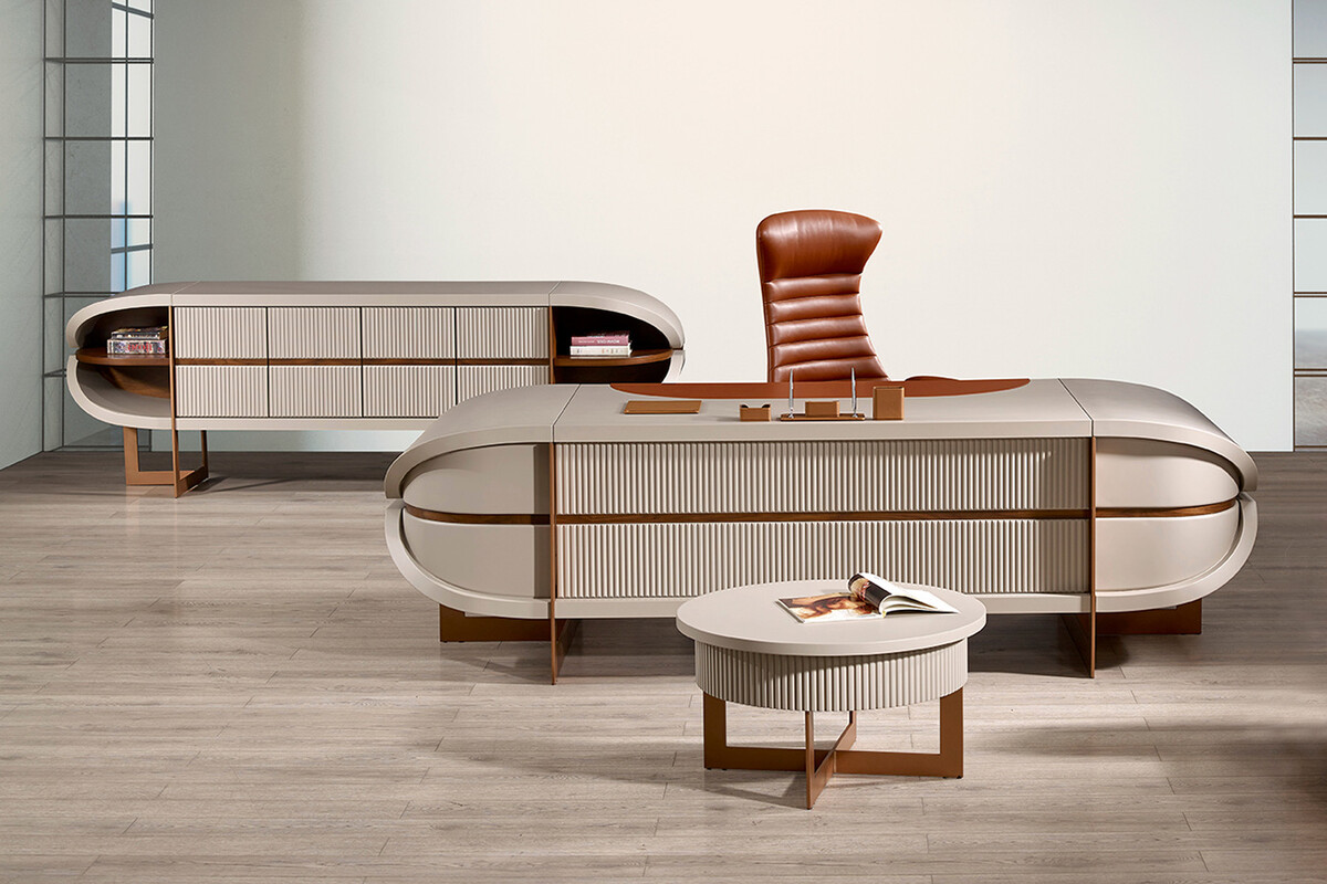 Rasol Ahşap İşlemeli Makam Takımı, ofisinizde modernliği ve sofistikasyonu bir araya getiriyor. Takımın merkezi olan makam masası, yumuşak kıvrımları ve ön panelindeki dikey yivli ahşap detaylarıyla dikkat çeker; bu "işlemeli" görünüm, tasarıma derinlik ve zarafet katar. Bronz renkli metal ayaklar seçilen renkler ile çarpıcı bir kontrast ve modern bir duruş sergiler. Takımda yer alan geniş makam dolabı ve sehpa da masayla aynı akıcı hatları ve işlemeli panelleri taşıyarak, ofisinizde bütünlüklü ve şık bir depolama çözümü sunar. Rasol, sadece bir makam takımı olmanın ötesinde, her detayıyla özenle düşünülmüş, ilham veren bir çalışma ortamı vaat eder.