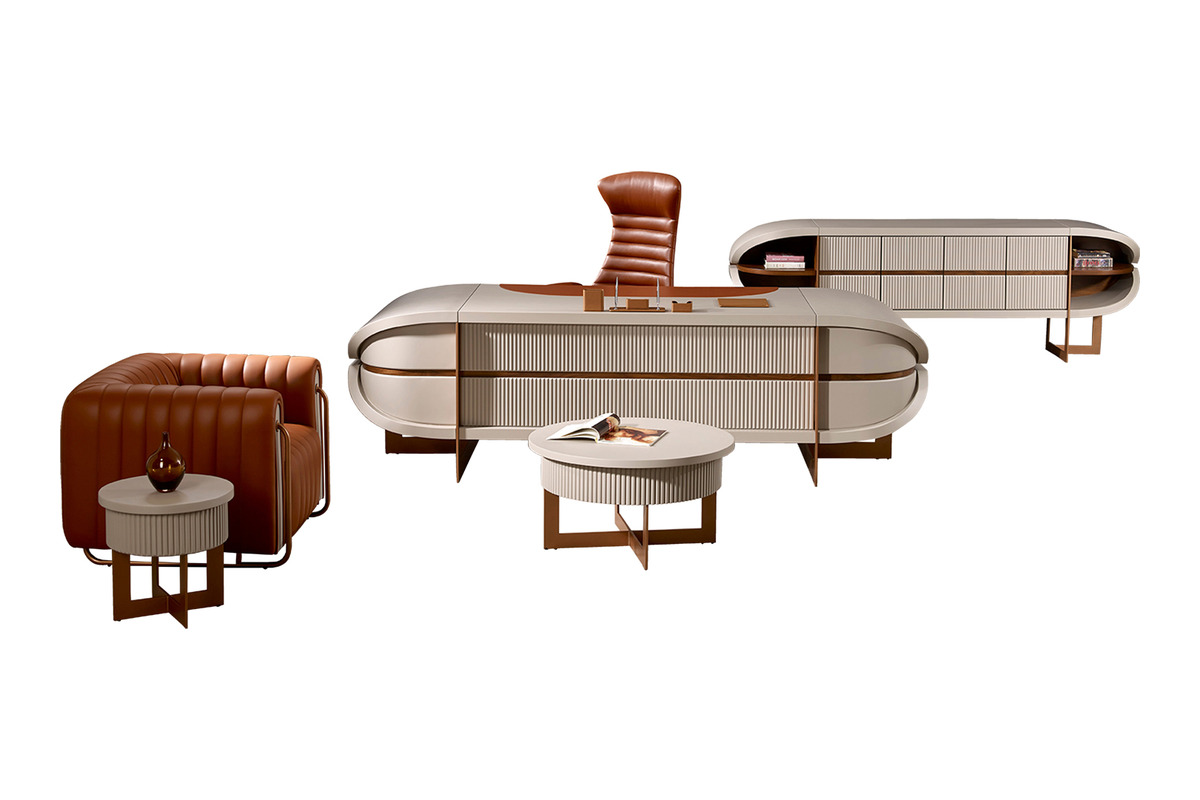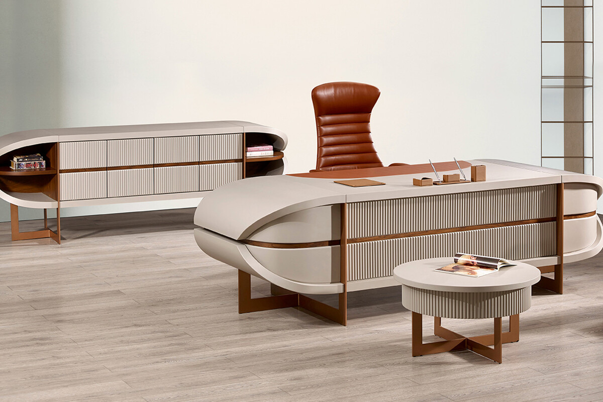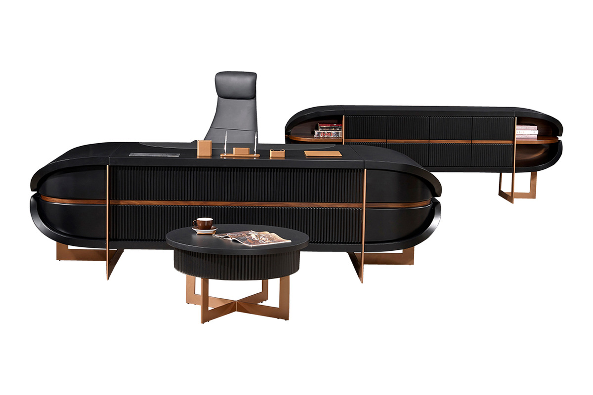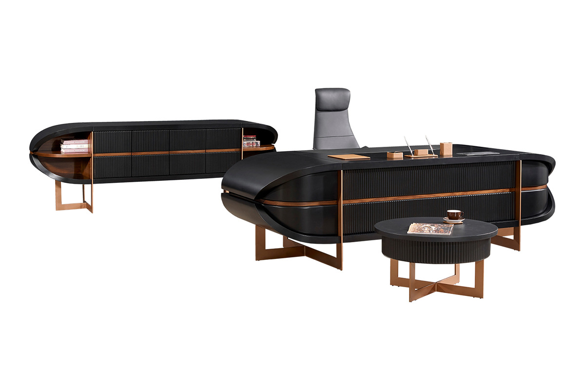 Rasol Ahşap İşlemeli Makam Takımı, ofisinizde modernliği ve sofistikasyonu bir araya getiriyor. Takımın merkezi olan makam masası, yumuşak kıvrımları ve ön panelindeki dikey yivli ahşap detaylarıyla dikkat çeker; bu "işlemeli" görünüm, tasarıma derinlik ve zarafet katar. Bronz renkli metal ayaklar seçilen renkler ile çarpıcı bir kontrast ve modern bir duruş sergiler. Takımda yer alan geniş makam dolabı ve sehpa da masayla aynı akıcı hatları ve işlemeli panelleri taşıyarak, ofisinizde bütünlüklü ve şık bir depolama çözümü sunar. Rasol, sadece bir makam takımı olmanın ötesinde, her detayıyla özenle düşünülmüş, ilham veren bir çalışma ortamı vaat eder.