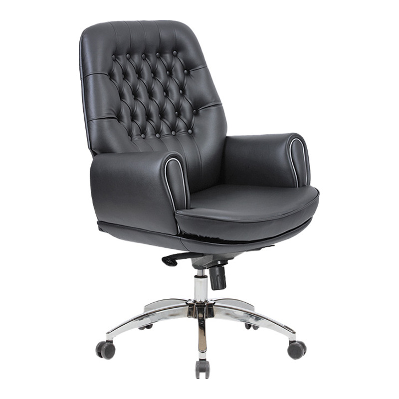Quenn Krom Yıldız Ayaklı Toplantı Koltuğu, ofis ortamına klasik bir zarafet ve sofistike bir hava katan özel bir tasarıma sahiptir. Koltukta bulunan kapitone dikiş detayları, ürüne lüks bir görünüm kazandırırken, dolgun döşemesi gün boyu süren kullanımlarda dahi üst düzey konfor sunar. Beyaz boru fitil detayı, koltuğun siyah deri döşemesiyle kontrast oluşturarak modern bir dokunuş ekler. Parlak krom yıldız ayaklar, koltuğun dayanıklılığını ve ofis içinde kolay hareket kabiliyetini destekler. Bu toplantı koltuğu, hem estetik beklentileri karşılar hem de uzun süreli ve konforlu bir çalışma deneyimi sunar.