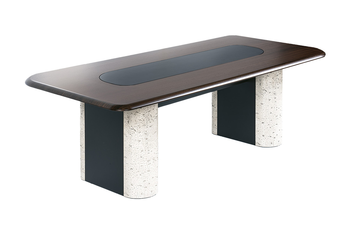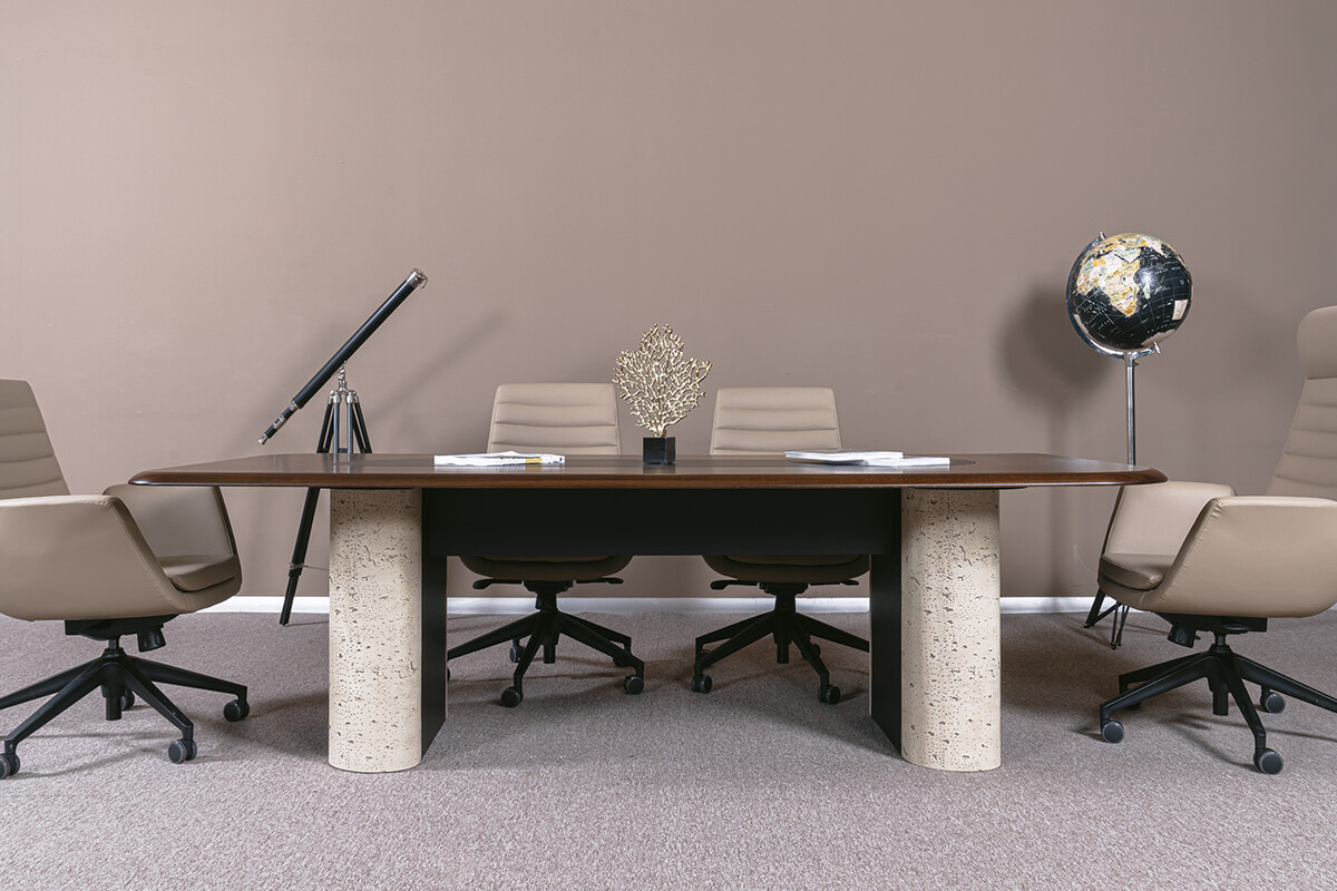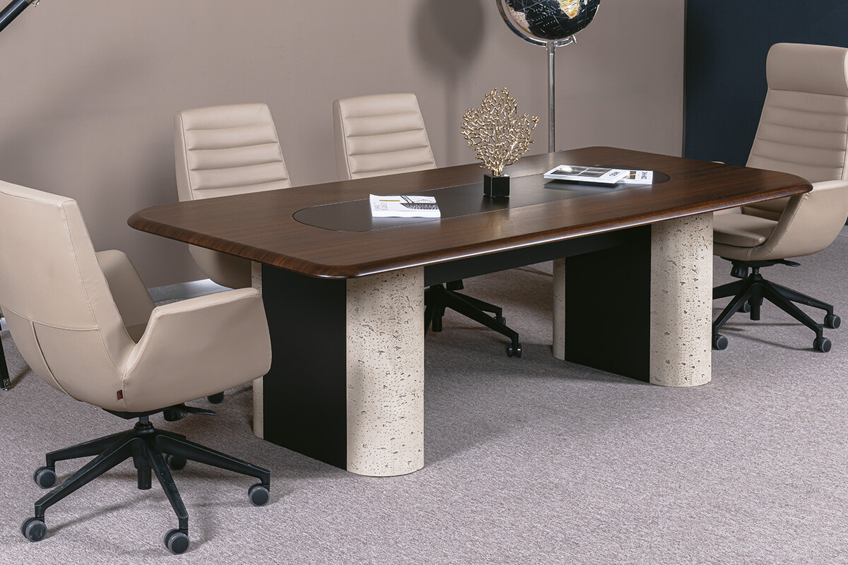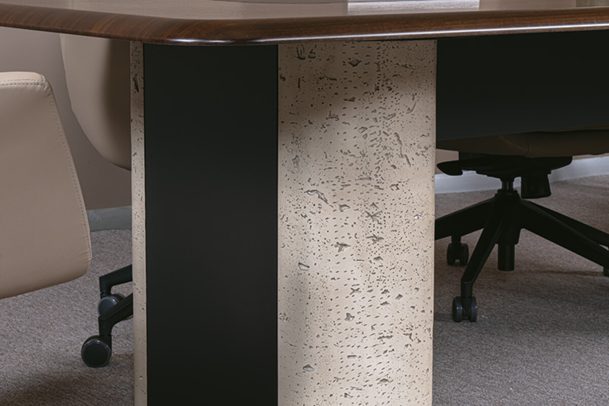 Ofisinizdeki toplantı deneyimini yeniden tanımlayacak Dolvesso Dekoratif Toplantı Masası ile tanışın. Bu modern toplantı masası, koyu ahşap kaplama tablası ve ortasında yer alan şık siyah detayla modern ofislerin estetik beklentilerini karşılar. Masanın en belirgin özelliği, görsel bir heykel niteliğindeki, iki tarafı açık renkli taş dokulu bir materyalden, ortası ise koyu renkli pürüzsüz bir yüzeyden oluşan masif ayaklarıdır. Bu kontrastlı tasarım, masaya özgünlük ve sağlam bir duruş kazandırır. Dolvesso, sadece işlevsel bir ofis toplantı masası olmakla kalmaz, aynı zamanda ofisinizin genel estetiğini yükselten güçlü bir tasarım objesidir.