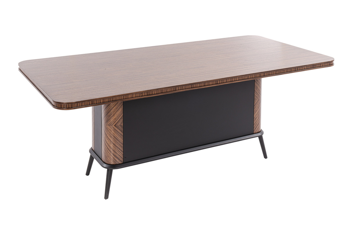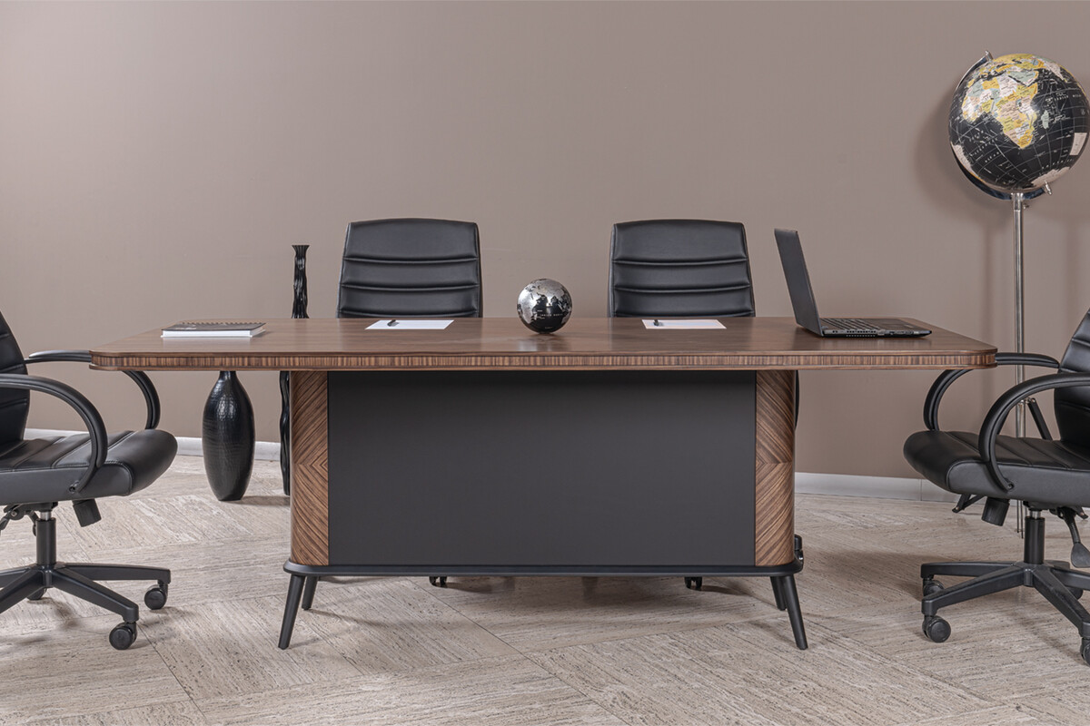 Formia Toplantı Masası, şık ceviz ahşap kaplaması ve güçlü formuyla toplantı odalarına prestij katar. İşlevselliği ve modern görünümü bir arada sunar.