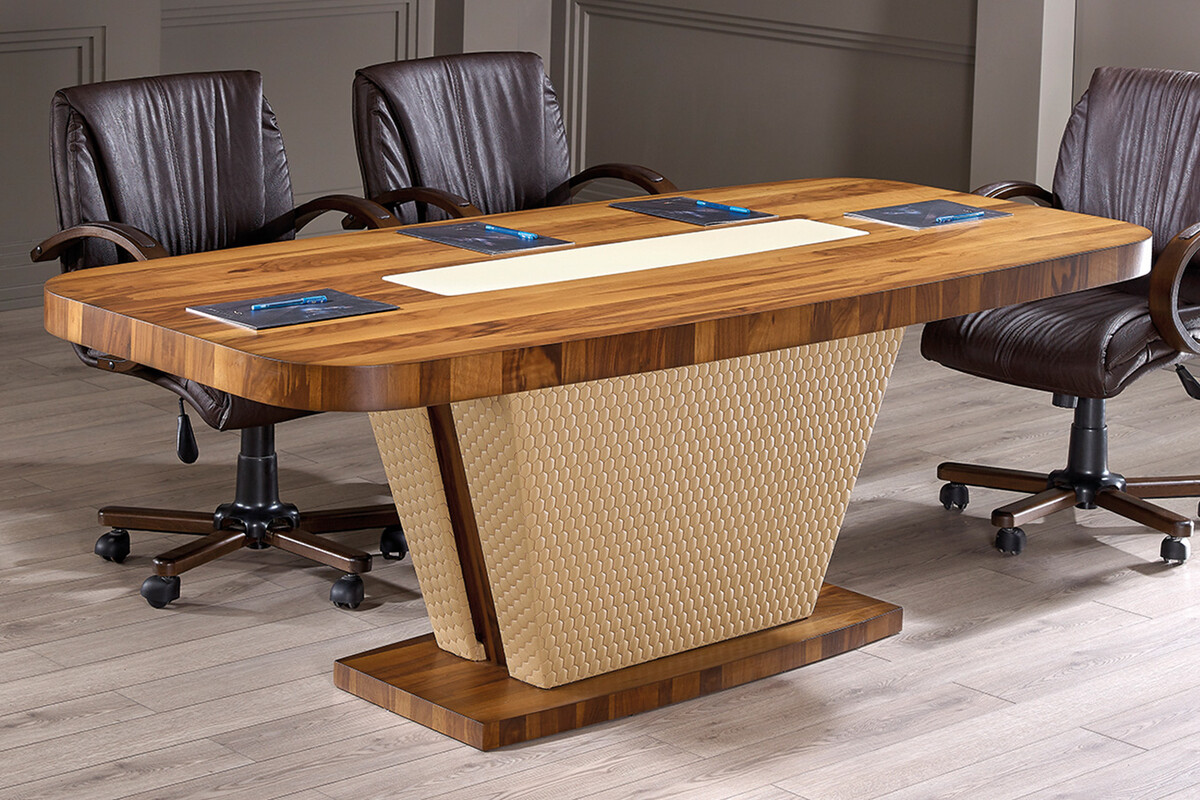 Monial Toplantı Masası, parke ceviz kaplaması ve deri detaylarıyla yönetici ofisleri ve makam toplantı odaları için tasarlanmış prestijli bir toplantı masasıdır. Doğal ceviz kaplamanın sıcak dokusu, masaya zamansız bir şıklık kazandırırken, deri detaylar tasarıma lüks bir karakter katar. Geniş tabla yapısı, ekip toplantıları ve sunumlar için konforlu bir kullanım alanı sunar. Kurumsal ofislerde güçlü bir izlenim oluşturmak isteyenler için ideal bir seçimdir.