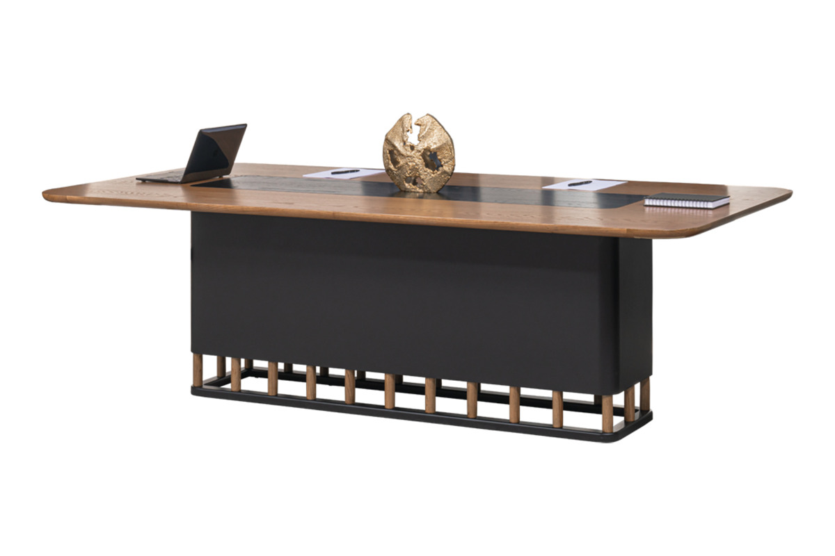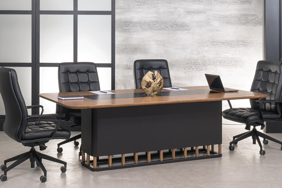 Palencia Toplantı Masası, eskitme meşe kaplama yüzeyi ve lake detaylarıyla takımın modern havasını toplantı odasına taşır. Geniş masa tablası, ekip görüşmeleri, müşteri buluşmaları veya beyin fırtınası oturumları için yeterli alan sunar. Ofiste marka kimliğini yansıtan, kurumsal imajı pekiştiren bir odak noktası olarak görev yapar.