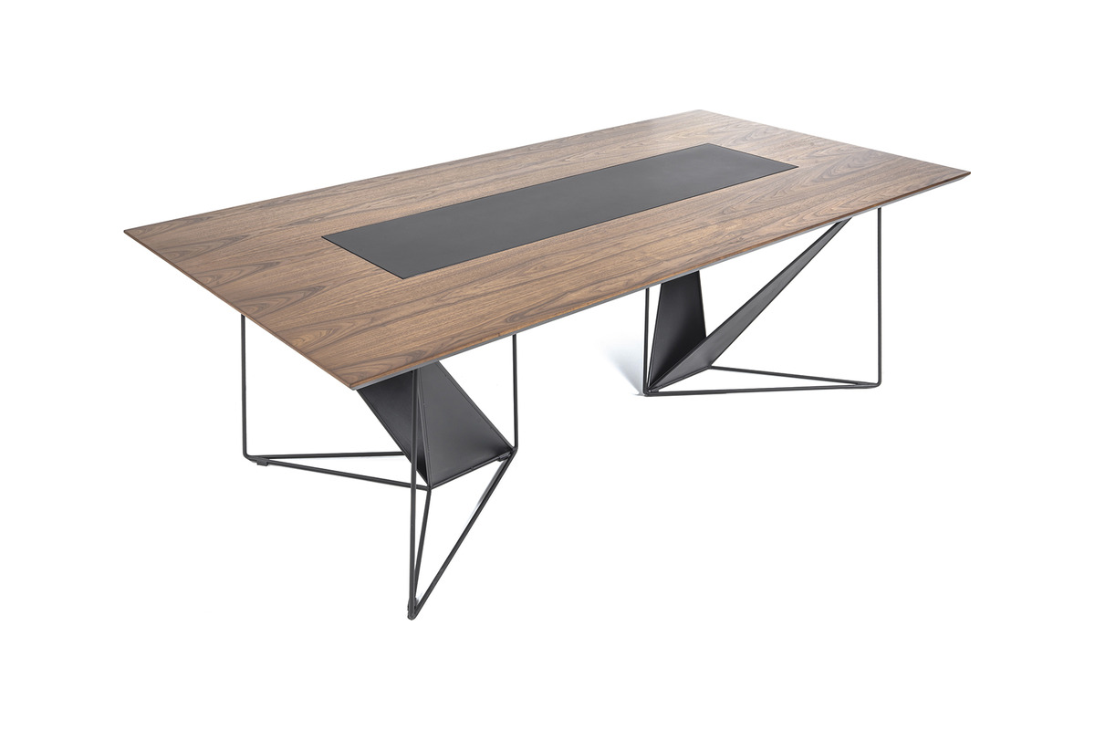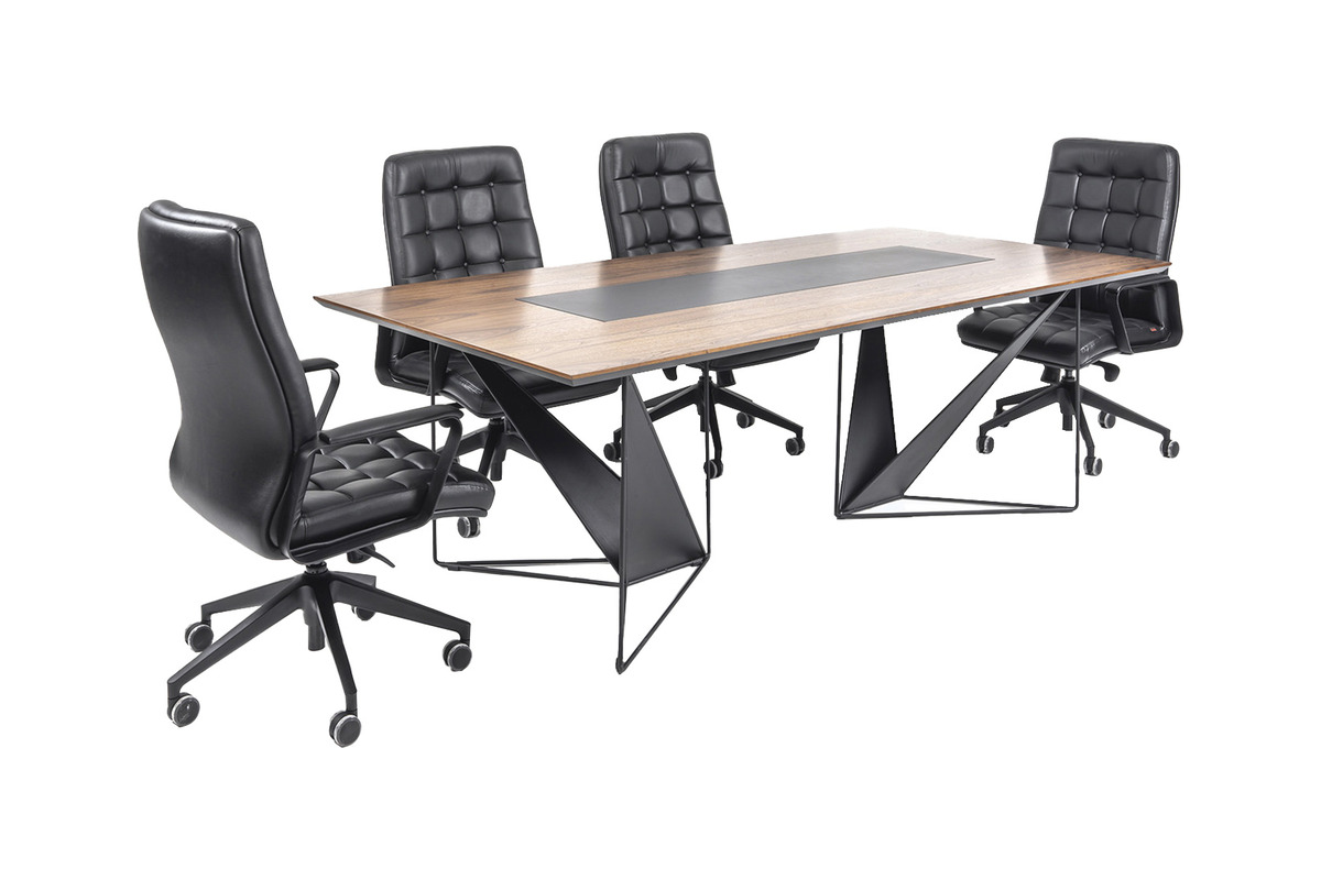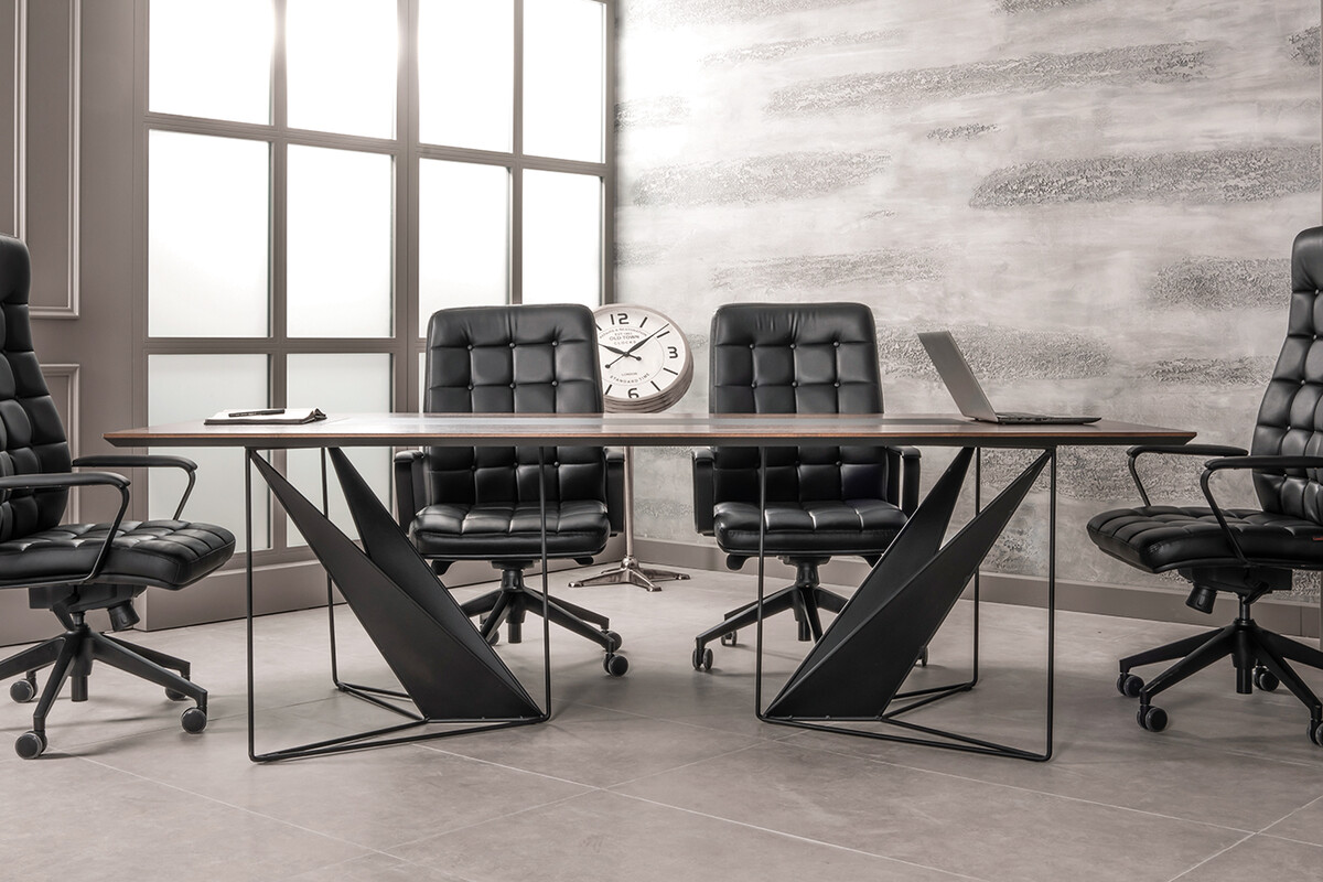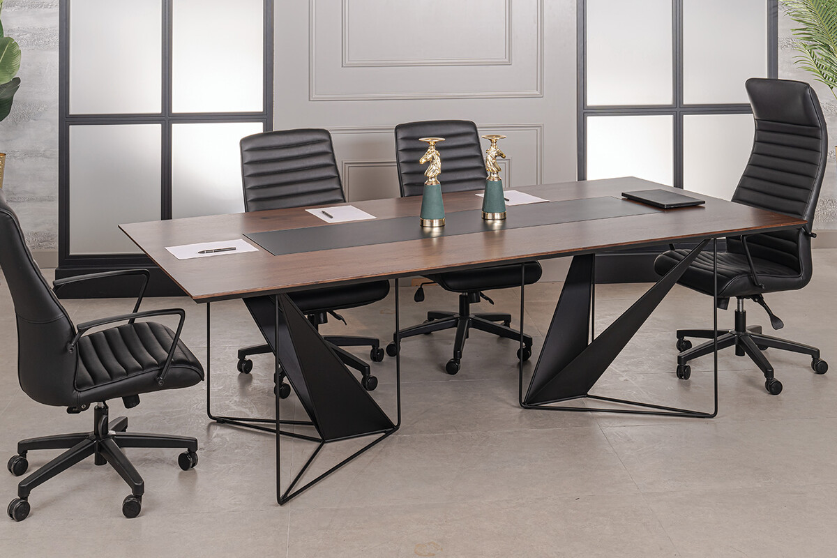 Ployer Tasarım Toplantı Masası, toplantı odalarınıza dinamik ve ilham verici bir atmosfer katmak üzere özel olarak tasarlanmıştır. Masanın kendine özgü geometrik metal ayakları, modern estetiği vurgularken, sağlam ve dengeli bir yapı sunar. Geniş ve koyu renkli masa tablası, tüm katılımcılara rahat bir çalışma alanı sağlarken, merkezi sümen detayı kablo yönetimi için şık bir çözüm sunar.