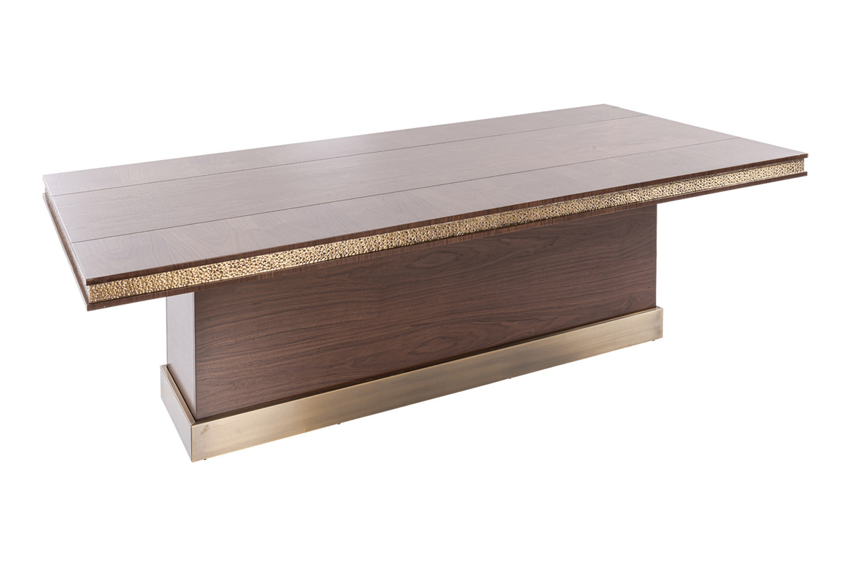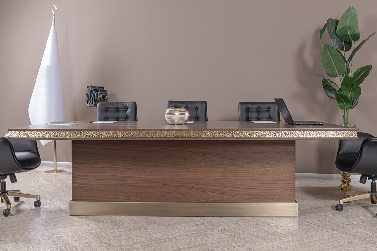 Vivanta Toplantı Masası, zengin ceviz ahşap kaplaması ve detaylı işlemeleriyle makam ve toplantı odalarına prestij katar.