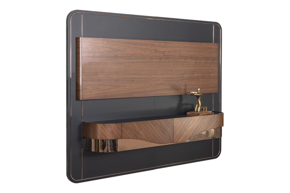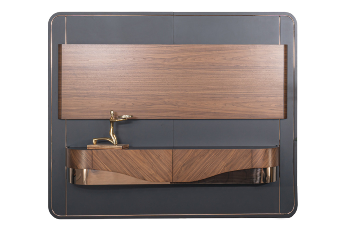 Soprano TV Ünitesi, zarif ahşap dokusu ve modern çizgileriyle makam odasında görsel bir bütünlük oluşturur. Dalgalı detayları ve güçlü formu sayesinde hem dekoratif hem fonksiyonel bir çözüm sunar. Şık depolama alanlarıyla düzeni korurken, mekanın prestijli havasını tamamlar.