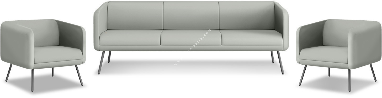 Seira Metal Ayaklı Kanepe Takımı, farklı büyüklükteki bekleme alanlarına ve ofis içi dinlenme köşelerine uyum sağlar. Üçlü kanepe ve iki tekli kanepeden oluşan bu set, misafirler ve müşteriler için konforlu bir oturma alanı oluşturur. Koltukların geniş oturma alanı ve ergonomik yapısı, uzun süreli oturmalarda bile rahat bir deneyim sağlar.
