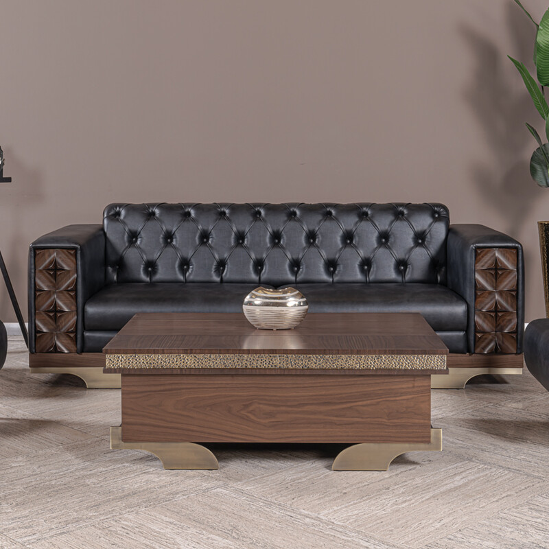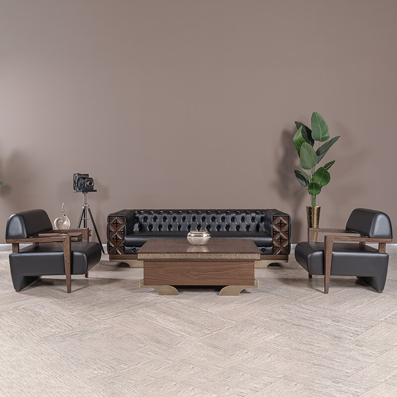 Vivanta Ahşap Detaylı Kanepe Takımı, çağdaş mekanlara modern lüks bir hava katmak üzere tasarlanmıştır. Siyah deri görünümlü döşemesi ve özellikle yan kısımlarda kullanılan doğal ahşap detaylar, takıma benzersiz bir estetik katar. Bu detaylar, Vivanta klasik kanepe takımına karakteristik bir şıklık ve zengin bir doku kazandırır. Salonlar, lobi alanları veya yönetici ofisleri gibi prestijli mekanlar için ideal bir seçimdir.