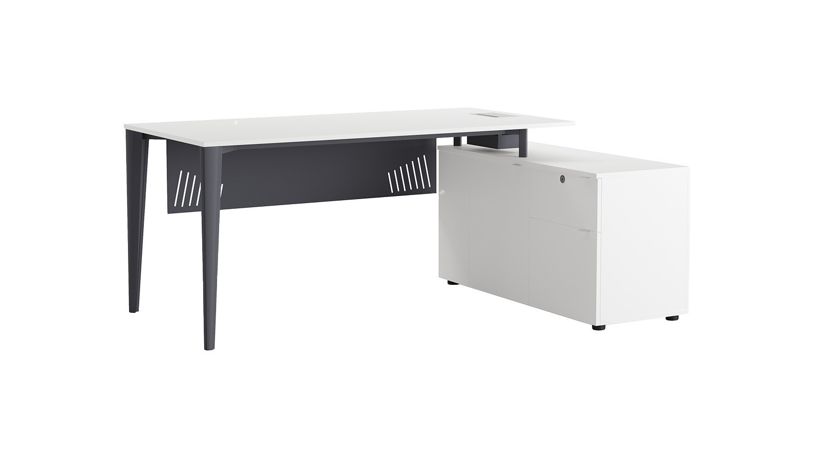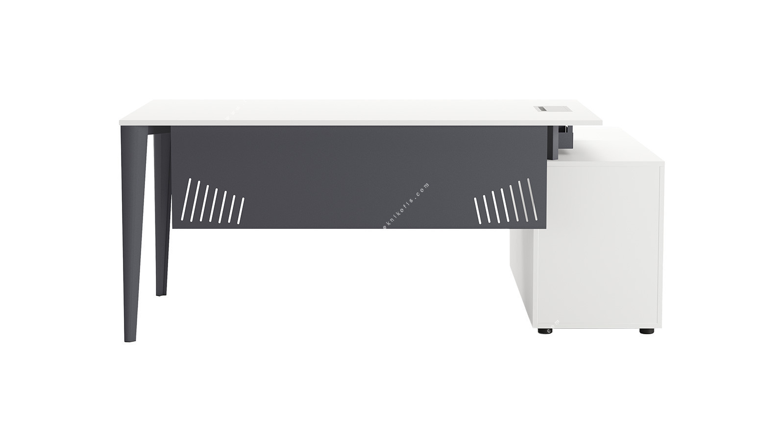 Power Etajerli Ofis Masası, güçlü duruşunu sade bir zarafetle birleştirir. Geniş yüzey alanı, etajer seçenekleri ve değiştirilebilir ön panel yapısı sayesinde farklı ofis düzenlerine kolayca uyum sağlar. Profesyonel alanlar için güçlü bir merkez oluşturur.