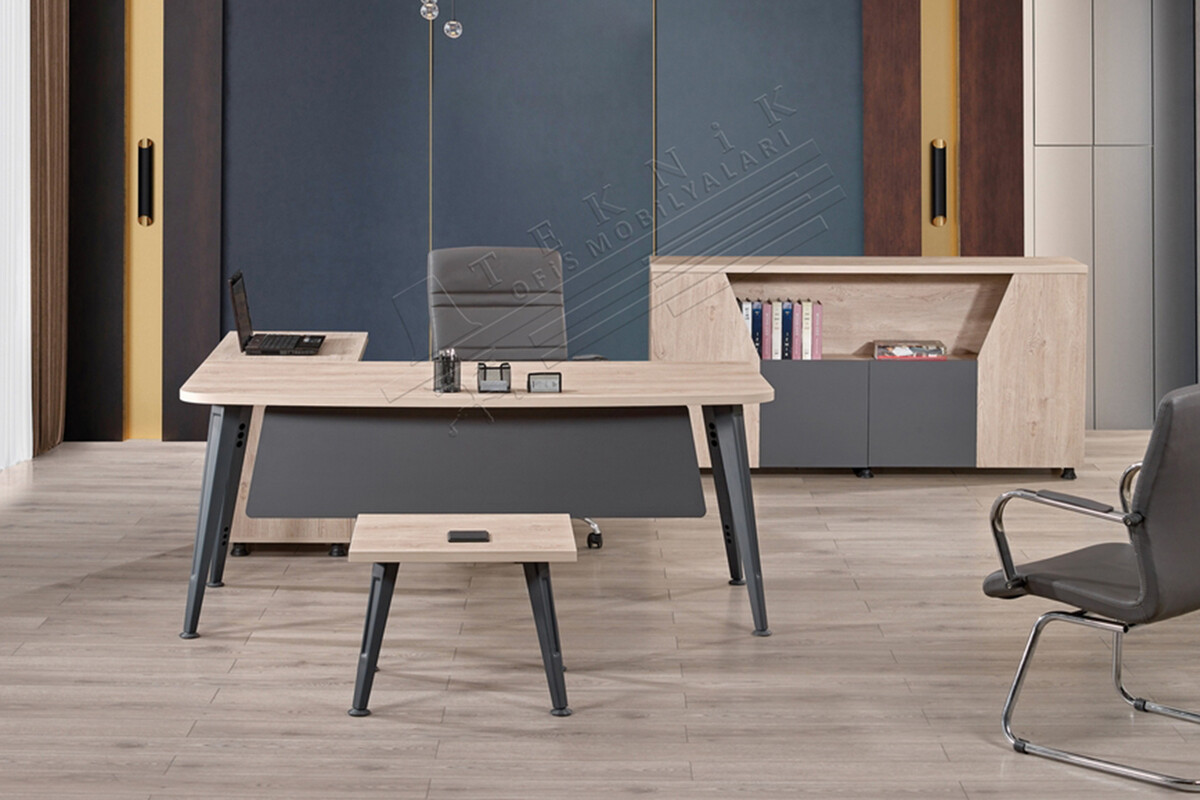 Afrodit Müdür Takımı, modern ofislerin depolama ve estetik ihtiyaçlarını karşılamak üzere tasarlanmış kapsamlı bir mobilya setidir. Takım, geniş bir masa, masanın yanında kullanmak için keson ve etajer tablası, depolama dolabı ve uyumlu bir sehpadan oluşmaktadır. Tüm parçalarda çağdaş bir estetik yakalanmıştır. Masanın zarif metal ayakları ve sade tasarımı takıma modern bir dokunuş katmaktadır.
