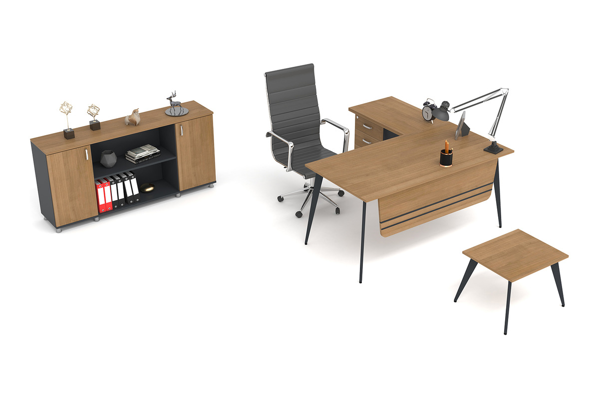 Ofis ortamınıza modern ve sofistike bir estetik katmak isteyenler için Bafa L Personel Takımı, dengeli tasarımıyla dikkat çeker. Ahşabın doğal ve sıcak tonları ile koyu renklerin uyumlu kombinasyonu, mekana dinamik bir enerji katarken, masanın minimalist çizgileri ve ince ayak detayları şık bir duruş sergiler.