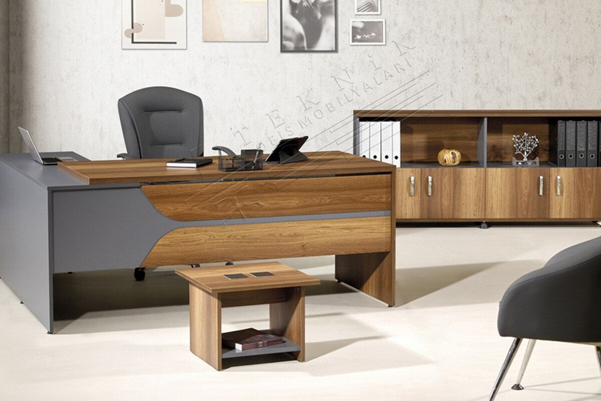 Grana Çift Renk Ahşap Tasarım Ofis Takımı, yöneticilik ofislerinin hem estetik hem de fonksiyonel ihtiyaçlarını karşılamak üzere tasarlanmıştır. Takım, geniş ve asimetrik bir çalışma masası, pratik bir sehpa ve çok amaçlı bir dosya dolabından oluşur. Açık meşe tonundaki çalışma yüzeyleri ve koyu renk detayların dinamik birleşimi, ofise modern ve sofistike bir atmosfer katar.