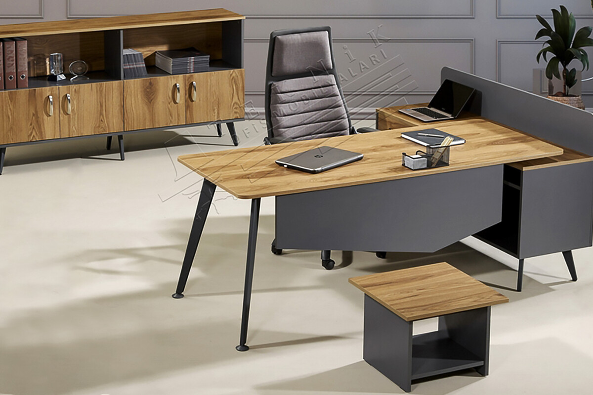 Nila Müdür Takımı, ofisinizde güçlü ve çağdaş bir atmosfer yaratmak üzere tasarlanmıştır. Geniş müdür masası, ergonomik bir çalışma alanı sunarken, ud ve antrasit renklerinin cesur birleşimiyle dikkat çeker. Masanın yanındaki entegre etajer ve depolama birimleri, tüm evrak ve ofis malzemelerinizi düzenli tutmanıza olanak tanır.