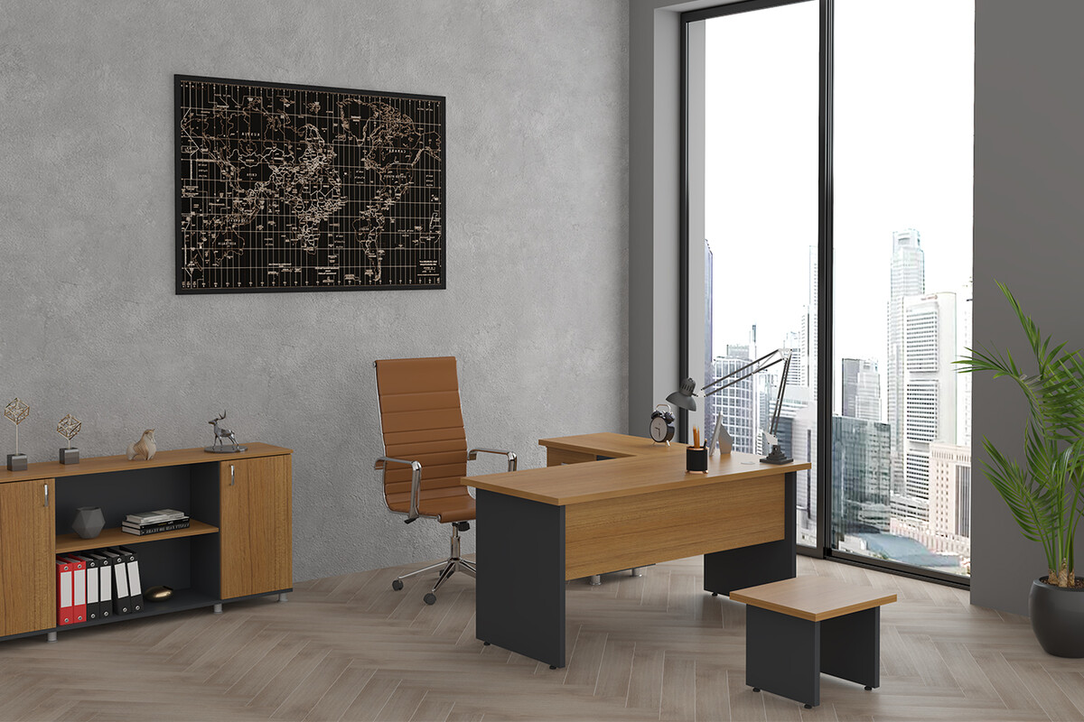Ahşabın sıcaklığı, mekana davetkar bir atmosfer katarken, koyu renklerin belirginliği kurumsal kimliğinizi vurgular. Bu ofis mobilyası takımı ile hem çalışanlarınız için ilham verici hem de misafirlerinizde olumlu bir ilk izlenim bırakacak, fonksiyonel ve estetik açıdan zengin bir çalışma ortamı yaratabilirsiniz.