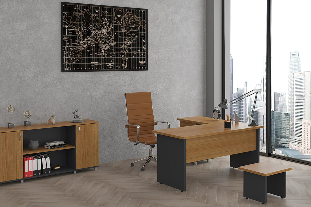 Pine L Personel Takımı, personel çalışma alanlarında maksimum verimlilik ve konfor sağlamak üzere tasarlanmıştır. Takım, geniş bir L çalışma masası, pratik bir mobil etajer ve uyumlu bir dosya dolabından oluşur. Açık ahşap tonları ve koyu renk detayların uyumu, ofise modern ve sıcak bir atmosfer katarken, kullanıcı dostu bir çalışma ortamı sunar.