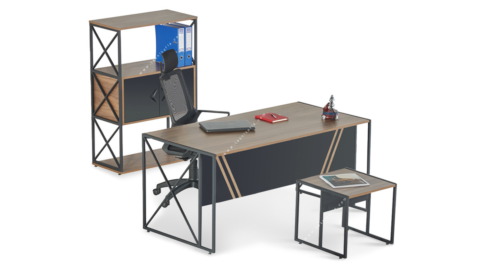 Bu modern ofis takımı, sadece işlevsel bir mobilya olmanın ötesinde, ofisinizin genel dekorasyonuyla mükemmel bir uyum sağlayarak görsel bir denge oluşturur. Tasarımındaki yalınlık ve metalin güçlü duruşu, mekanınıza modern bir derinlik ve estetik bir çekicilik katar.