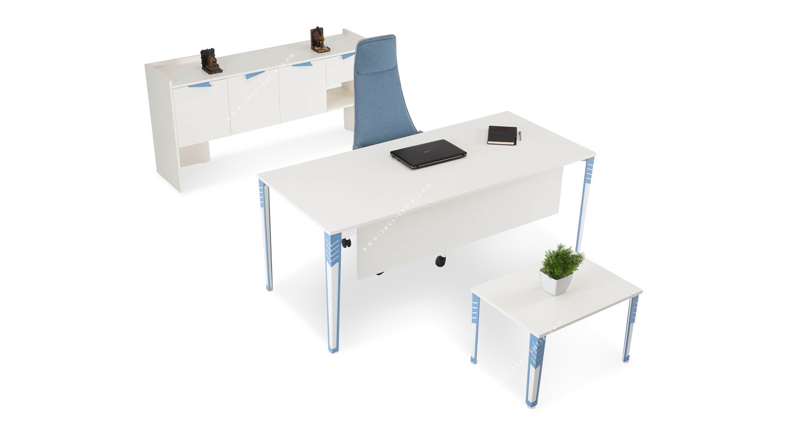 Veruna Modern Personel Takımı, modern ofis ortamlarına sade ve çağdaş bir estetik katmak üzere dizayn edilmiştir. Beyaz masa tablası, dolap ve sehpa yüzeyleri ile parlak mavi ve beyaz renklerdeki geometrik desenli ayakların birleşimi, takıma enerjik ve modern bir hava kazandırır. Masanın ve dolabın ön panelindeki kesim detayları, tasarıma dinamik bir dokunuş eklerken, takımın genel görünümü profesyonel bir atmosfer yaratır. Bu tasarım, ofisinizi sadece bir çalışma alanı olmaktan çıkarıp, çalışanlar için ilham verici ve düzenli bir mekana dönüştürür. Ofis takımının genelindeki uyumlu renk geçişleri ve minimalist çizgiler, mekana ferah ve düzenli bir hava kazandırır.