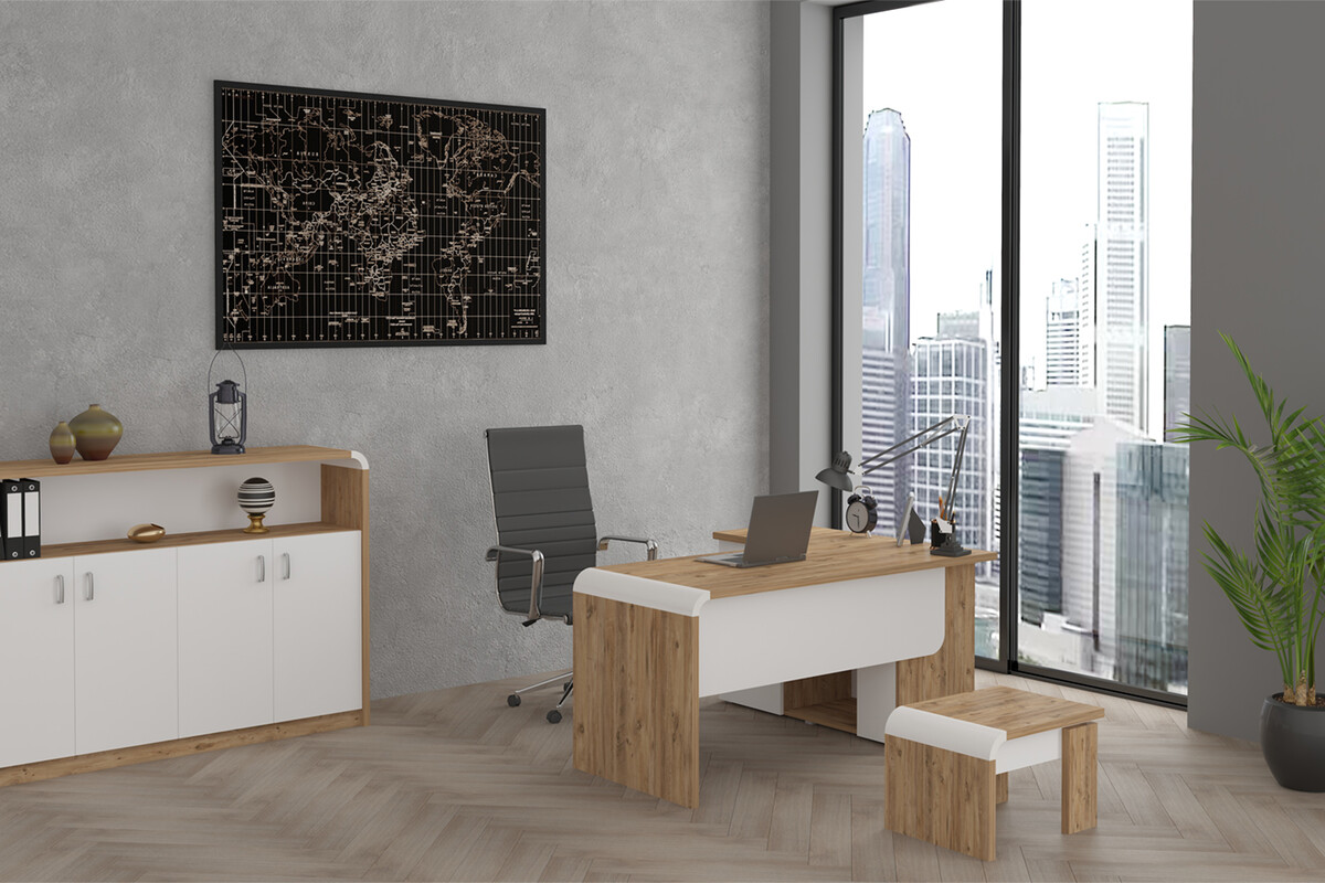Ofisinizin atmosferine tazeleyici bir dokunuş ve modern bir şıklık katmak isteyenler için Vivela Kesonlu L Personel Takımı, ahşabın doğal sıcaklığını berrak beyazın sadeliğiyle harmanlayan estetiğiyle göz doldurur. Bu uyumlu renk ve malzeme kontrastı, mekana aydınlık ve ferah bir his verirken, aynı zamanda profesyonel ve davetkar bir atmosfer yaratır. Masanın akıcı çizgileri ve dolaptaki minimalist kapak tasarımları, takımın genelinde temiz ve düzenli bir görünüm sağlar.