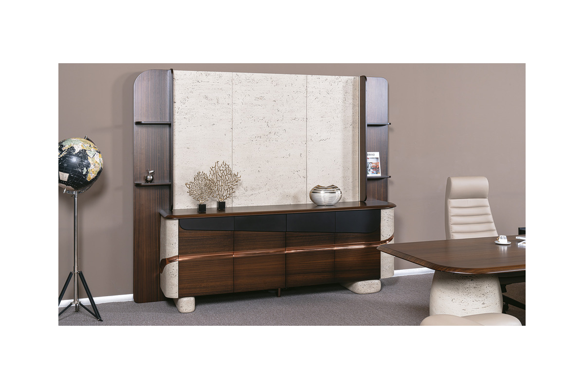 Yönetici odanızın ambiyansını baştan aşağı değiştirecek Dolvesso Arka Fon ile tanışın. Bu özel tasarım, merkezi yerleşimli, dokulu beyaz taş görünümlü büyük paneliyle dikkat çekerken, iki yanında yükselen kavisli koyu renk ahşap raflar fonksiyonelliği estetikle birleştirir. Bu dekoratif duvar paneli, ofisinize sadece bir arka plan olmaktan öte, güçlü bir sanatsal ifade ve prestijli bir görünüm kazandırır. Ürün içerisinde makam dolabı dahil değildir.
