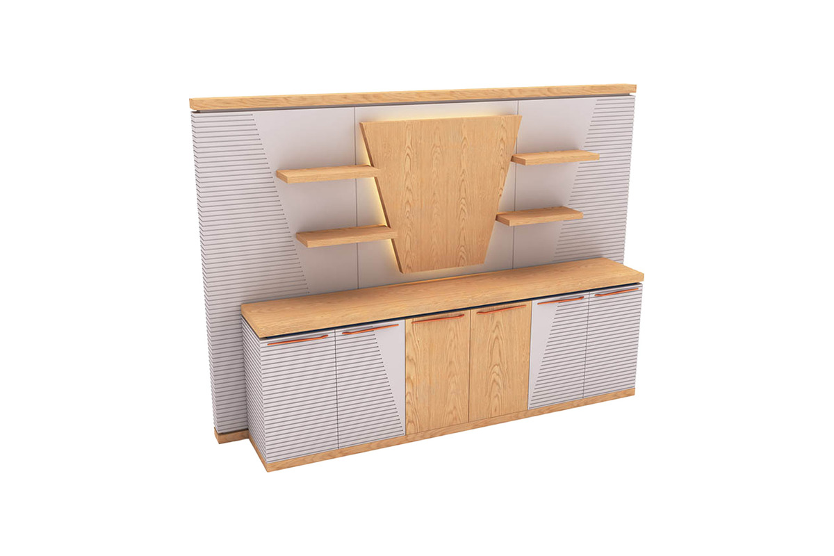Kronos Makam Arka Fonu, makam odasına derinlik ve zarafet katar. Masa ile aynı tasarım diliyle uyumlu ahşap kaplama yüzeyi, arka duvarlarda sade ama etkileyici bir dekoratif fon oluşturur. Panel, ofis alanının genel estetiğini tamamlayan ve mekâna sofistike bir karakter kazandıran güçlü bir dekoratif unsurdur. Ürün içerisinde konsol dahil değildir.