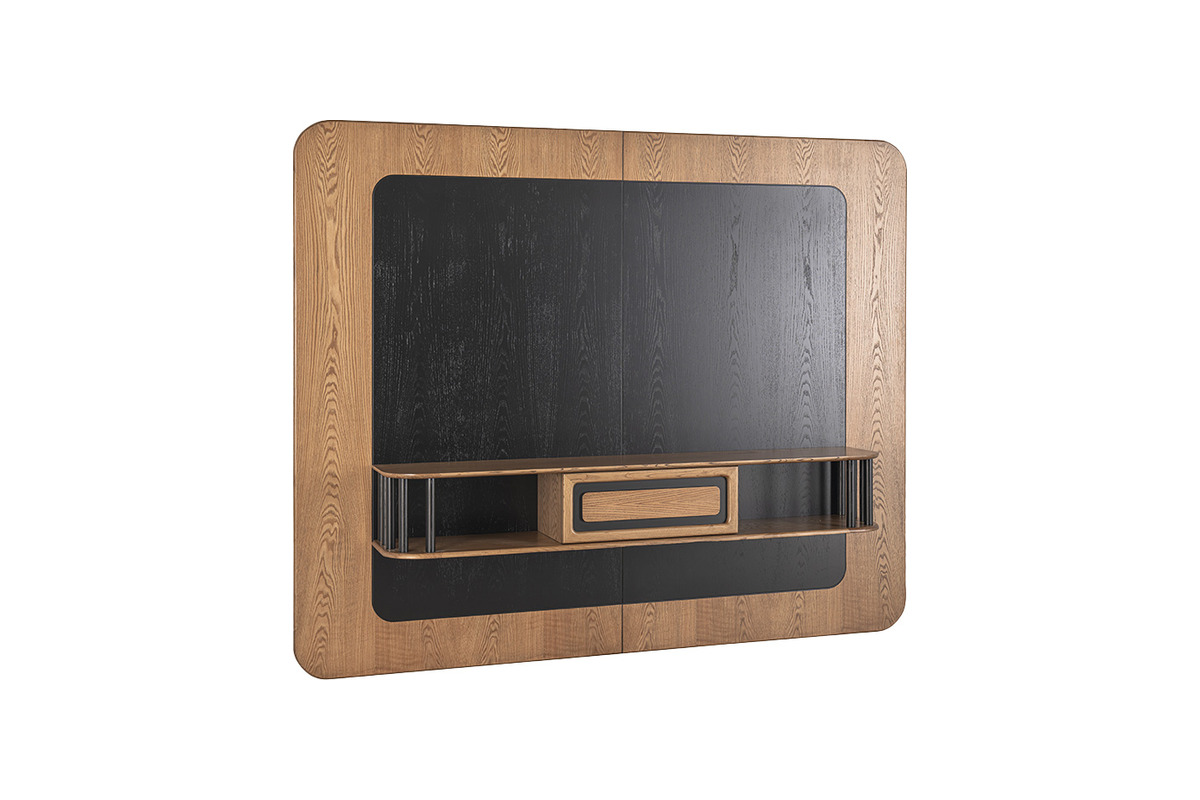 Palencia Makam TV Ünitesi, eskitme meşe kaplama ve lake detayların kombinasyonu ile makam odası ve toplantı köşesinde zarif ve modern bir medya alanı oluşturur. Televizyon ya da ekran için geniş ve dengeli bir yüzey sunarken alt kısımda raf sayesinde ekipman, doküman veya aksesuarlar düzenli şekilde saklanabilir. Ünitenin tasarımı, masa ve toplantı masasıyla uyumlu çizgiler taşıyarak ofiste bütünsel bir görünüm yaratır. Misafir kabulü, sunumlar veya video konferanslar için ideal.