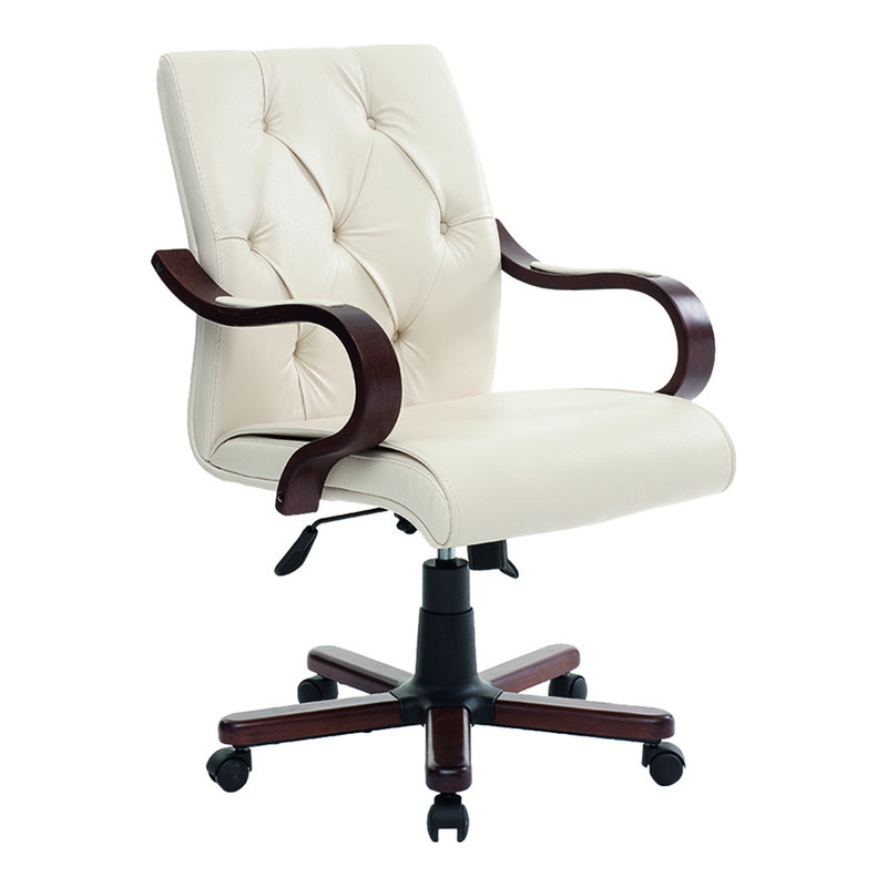 Ahşap toplantı koltuğunun içeriğinde poliüretan dökme sünger kullanılmış olup üzeri suni deri ile kaplanmıştır ve üzerinde koltuğun ergonomik yapısını ve estetik görünümünü destekleyen düğmeli kapitone detaya sahiptir. Sırt kısmı omurga yapısına uygun tasarlanmıştır. Ahşap ofis personel koltuğunun oturma fontu geniş ve rahat tasarlanmıştır. Kolları ve ayakları ahşap malzemeden imal edilmiştir. Oturma fontunun altında yer alan çift kollu mekanizması koltuğun yüksekliğini ve yaylanmasını ayarlamaya ve istenilen pozisyonda sabitlemeye yarar. Amortisörlü yapısı kullanım kolaylığı sunar. Ofis çalışma koltuğu ayakları ahşap ve tekerleklidir.