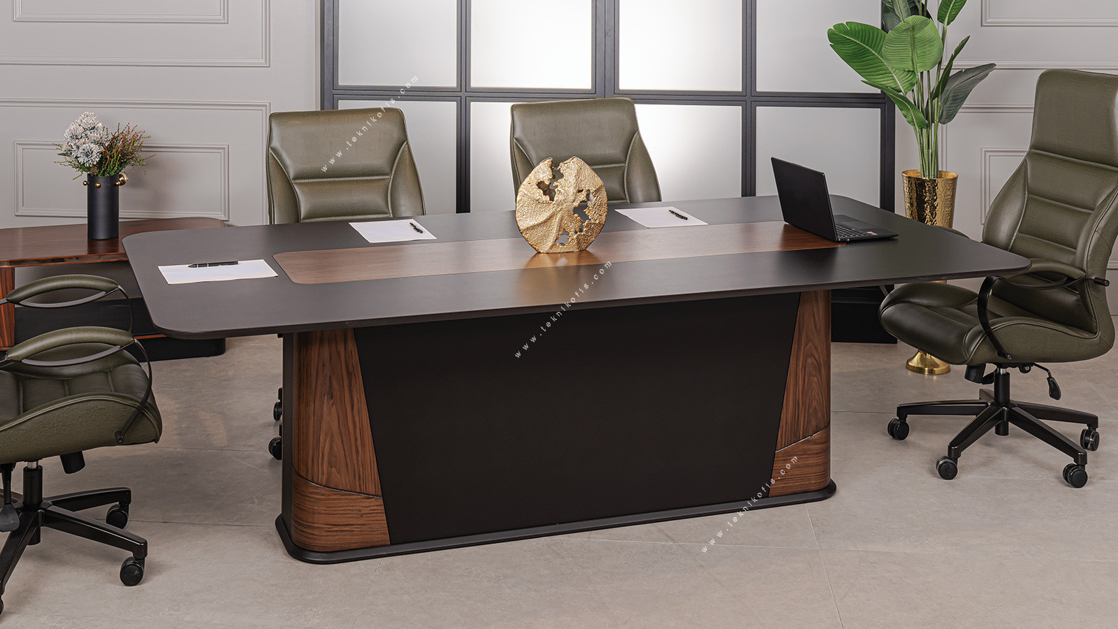 Admin Toplantı Masası, geniş yüzeyi, ceviz kaplama ve lake detaylarıyla toplantı odalarına prestijli ve profesyonel bir atmosfer getirir. Dayanıklı yapısı, ofisinizde ekip toplantılarından misafir kabulüne kadar çok yönlü kullanım olanağı sağlar.
